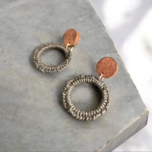 Unika örhängen med en rund trädetalj och en större cirkel i textil. Trädetaljen är i en varm brun ton medan textilcirkeln har en mörkare nyans. Perfekta för att ge en naturlig touch till din stil.