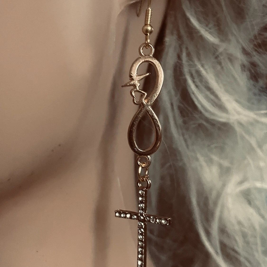 Elegant guldörhängen med en oändlighetssymbol och ett hängande kors dekorerat med små stenar. Perfekt för att ge en stilfull touch till din outfit.