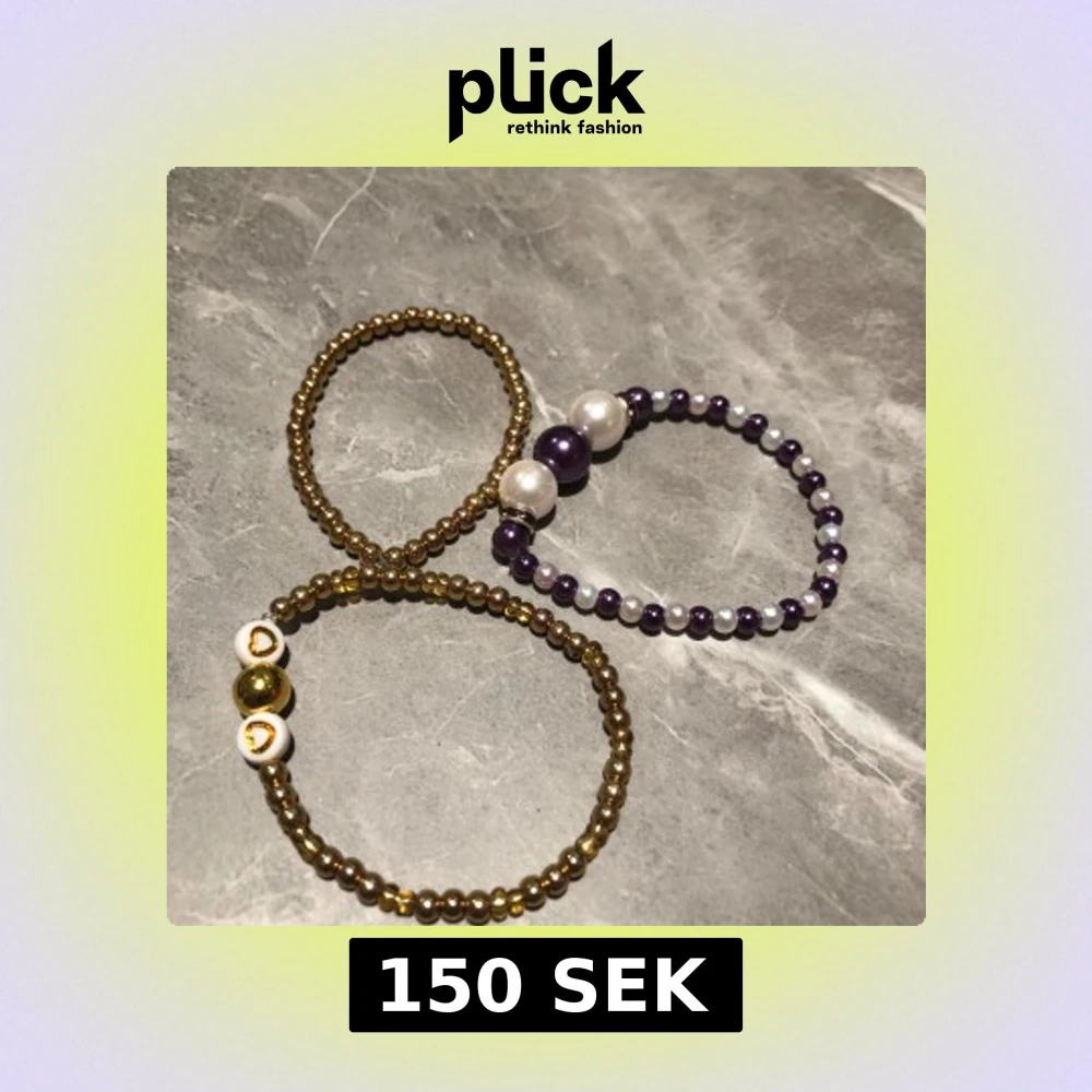Snyggt set med tre elastiska pärlarmband. Ett armband i guldton med små pärlor, ett med lila och vita pärlor samt ett med guldpärlor och vita detaljer med hjärtan. Perfekt för att mixa och matcha! Passar till dom med lite mindre handled. 150kr för alla 50 för ett