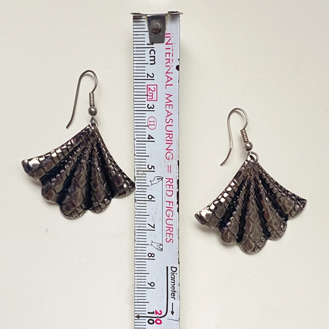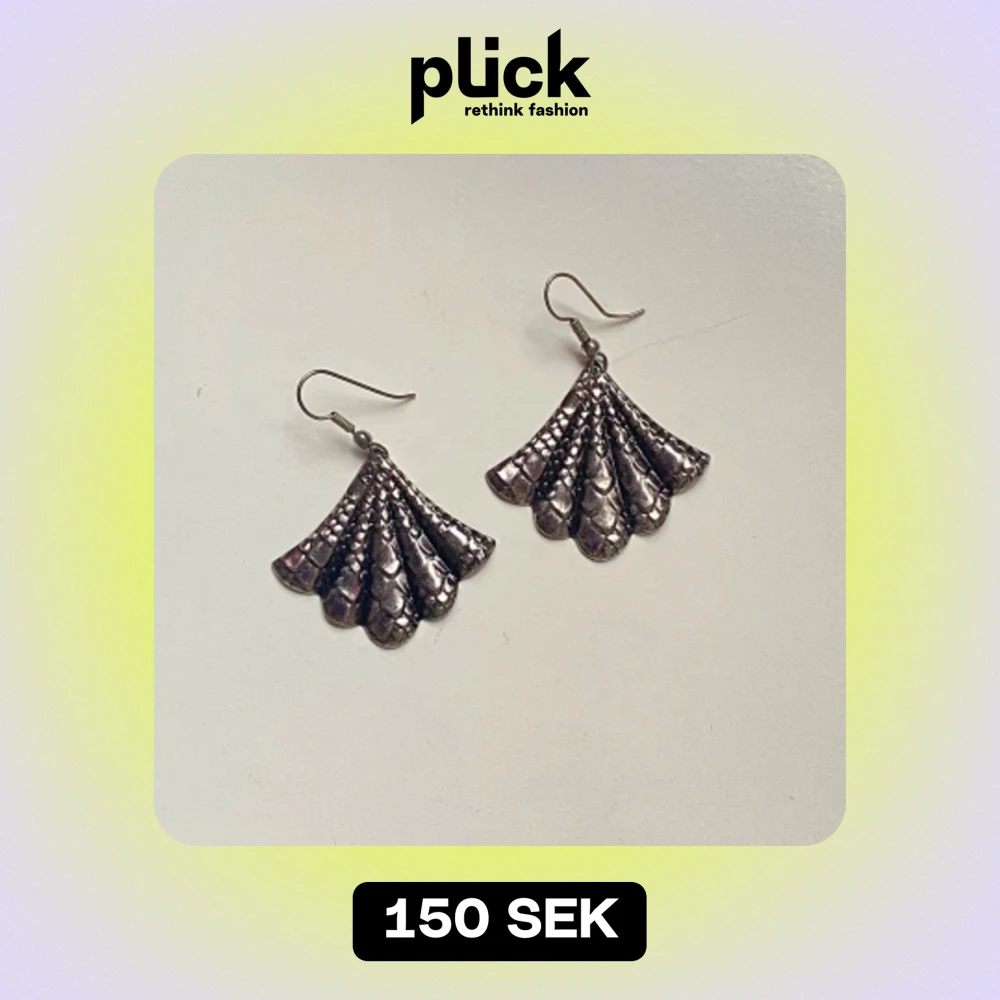 Säljer ett par unika silvriga örhängen i form snäckskal. De har en vacker textur som påminner om fjäll och ger en elegant look. Perfekta för att piffa upp vilken outfit som helst, oavsett om det är till vardags eller fest.