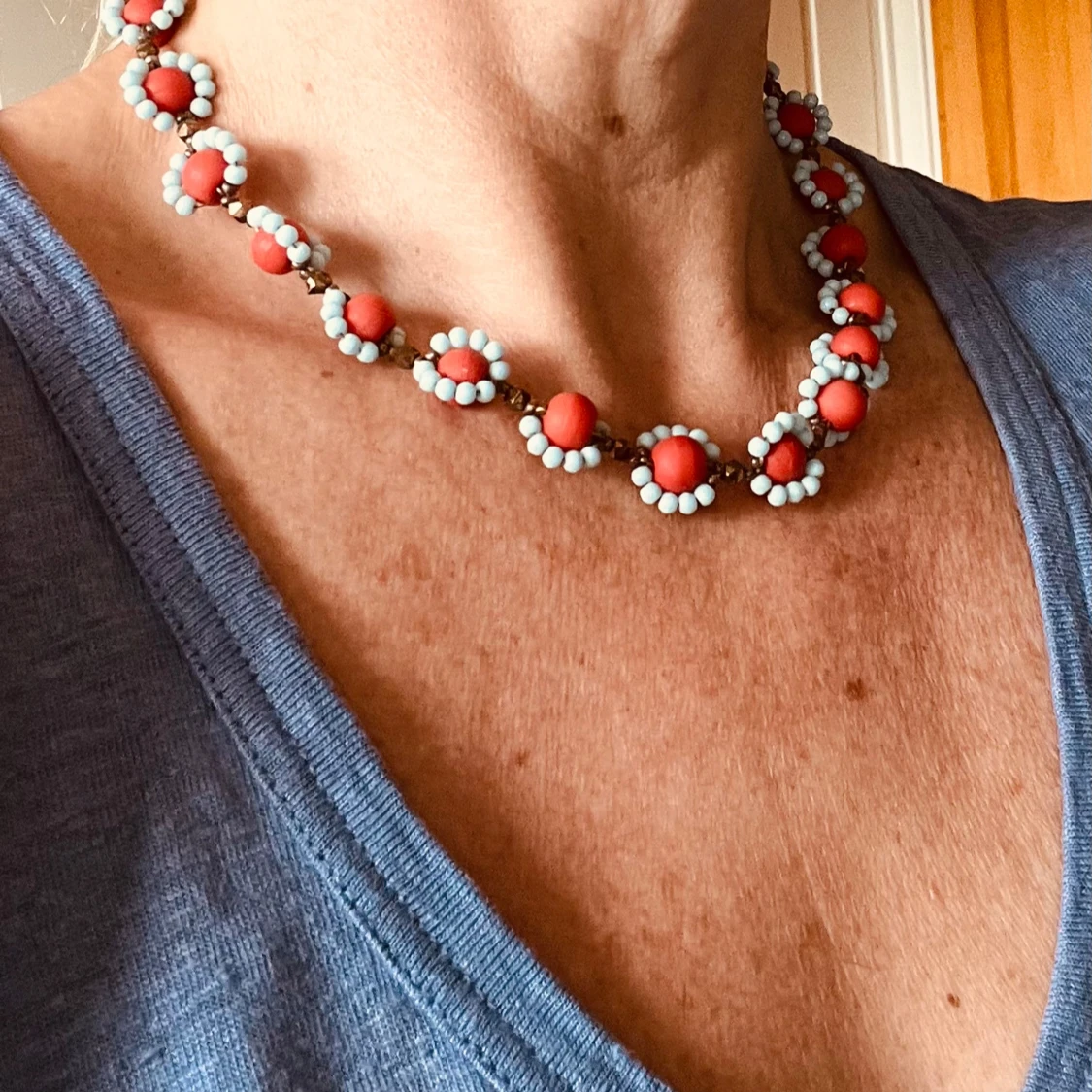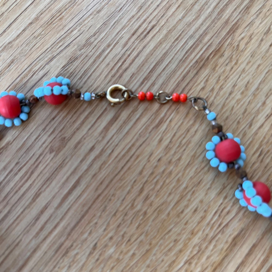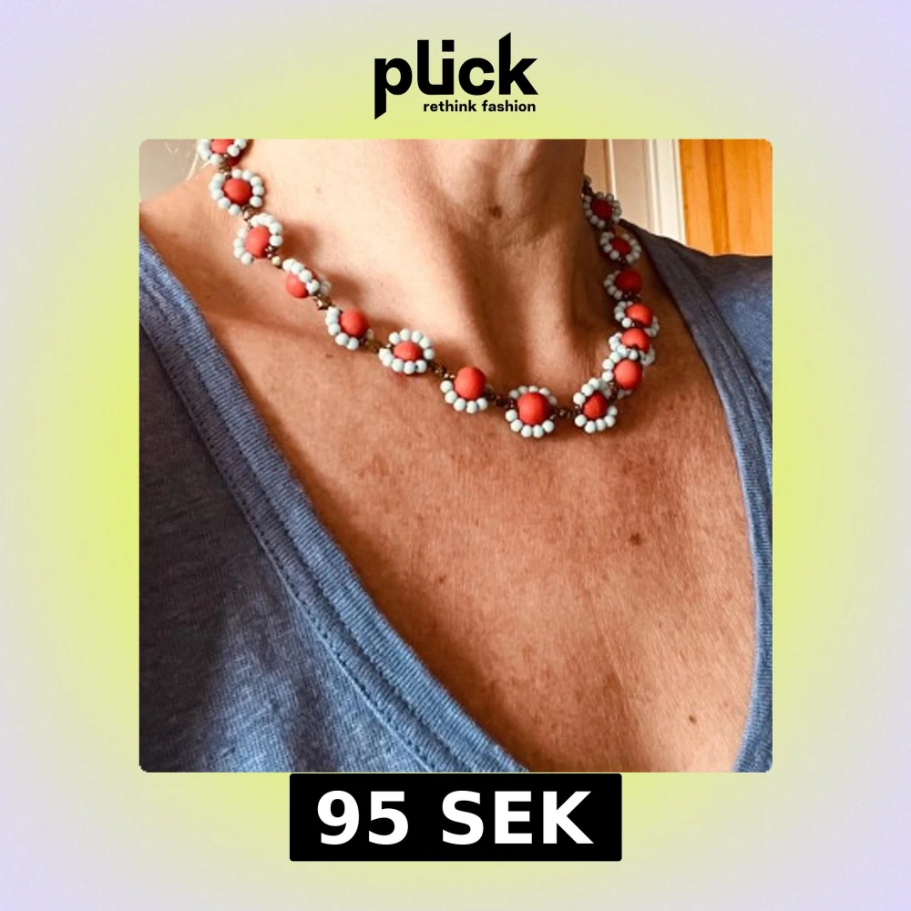 Unikt halsband med stora röda pärlor omgivna av små ljusblå pärlor. Pärlorna är sammanlänkade med bruna, blänkande detaljer och halsbandet har ett guldfärgat lås. Välgjort. Längd ca 42 cm. Inköpt i antikaffär.