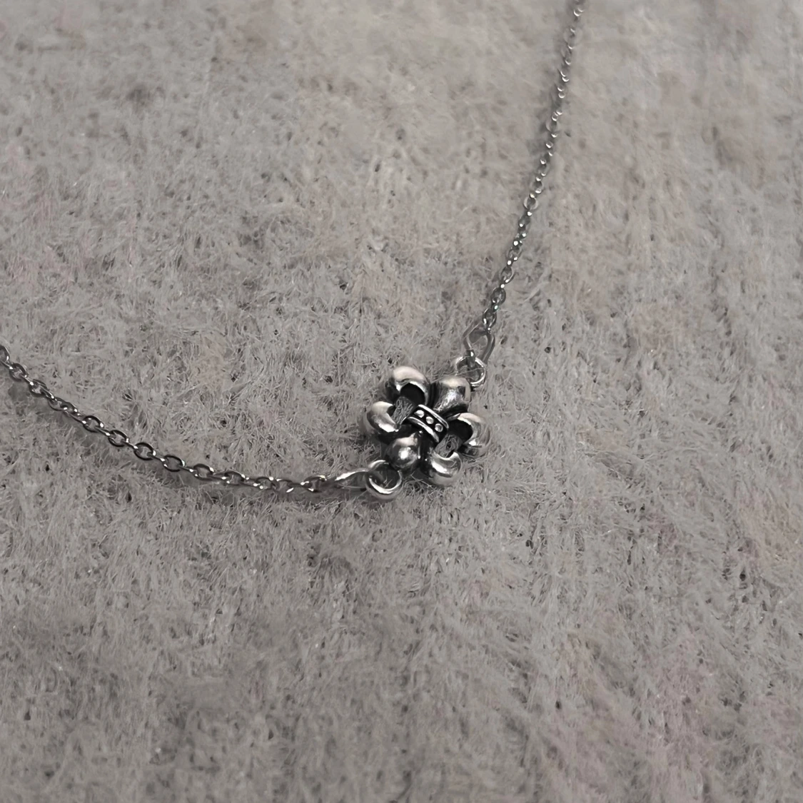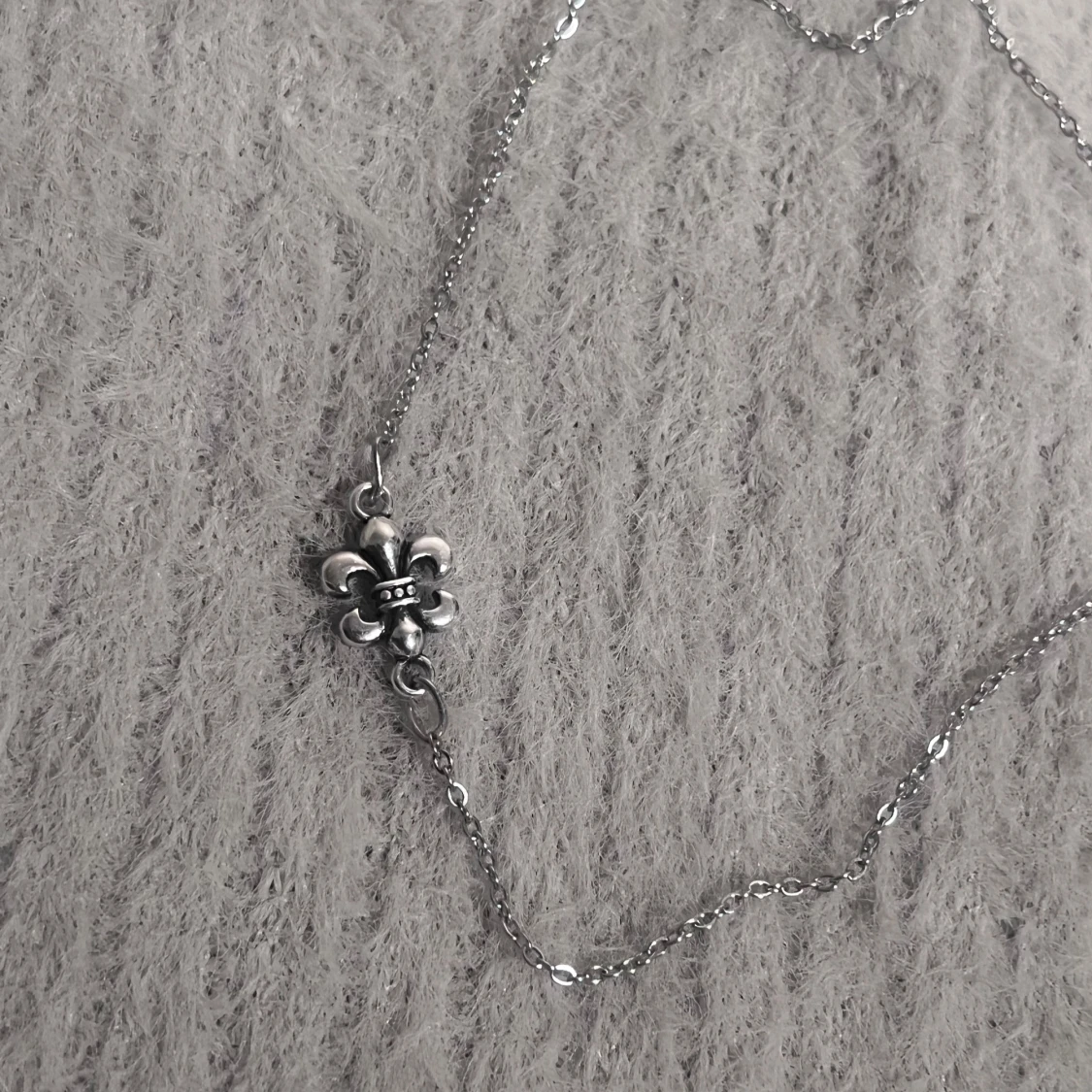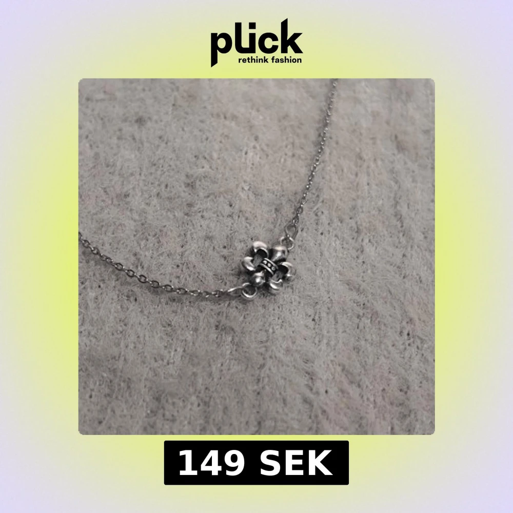 Kedja i rostfritt stål, 1,5 mm i diameter och cirka 50 cm lång. Hängsmycke cirka 1,5 cm.