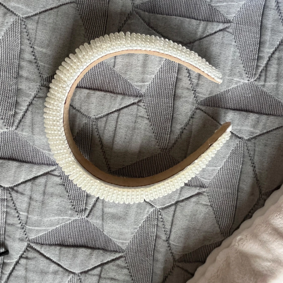 Säljer ett snyggt diadem i vit färg, täckt med små pärlor som ger en lyxig och trendig look. Diademet är brett och har en rundad form som sitter bekvämt på huvudet. Perfekt för att ge frisyren det lilla extra och passar till många olika stilar.