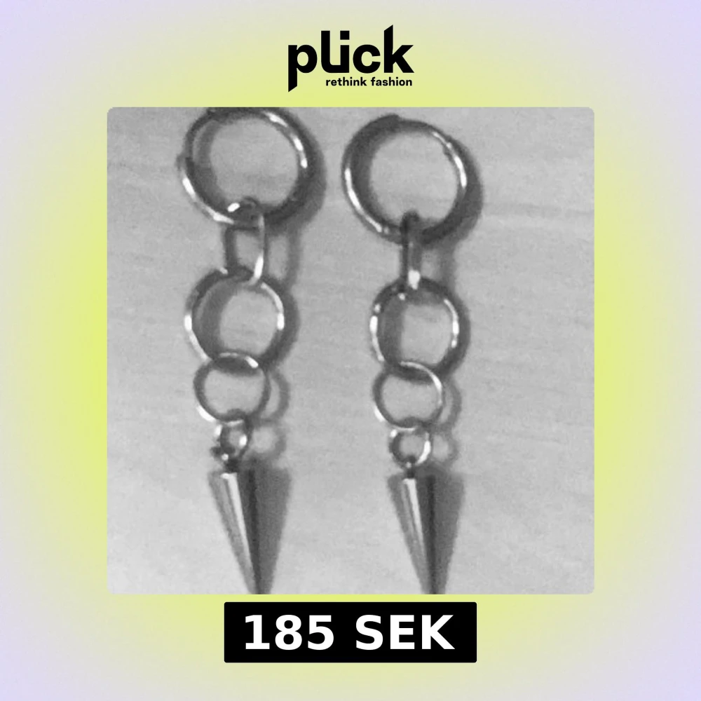 Säljer ett par coola silvriga örhängen med kedjor av ringar och spetsiga spikes längst ner. Perfekta för dig som gillar edgy och unik stil. Passar till både streetwear och alternativa outfits.