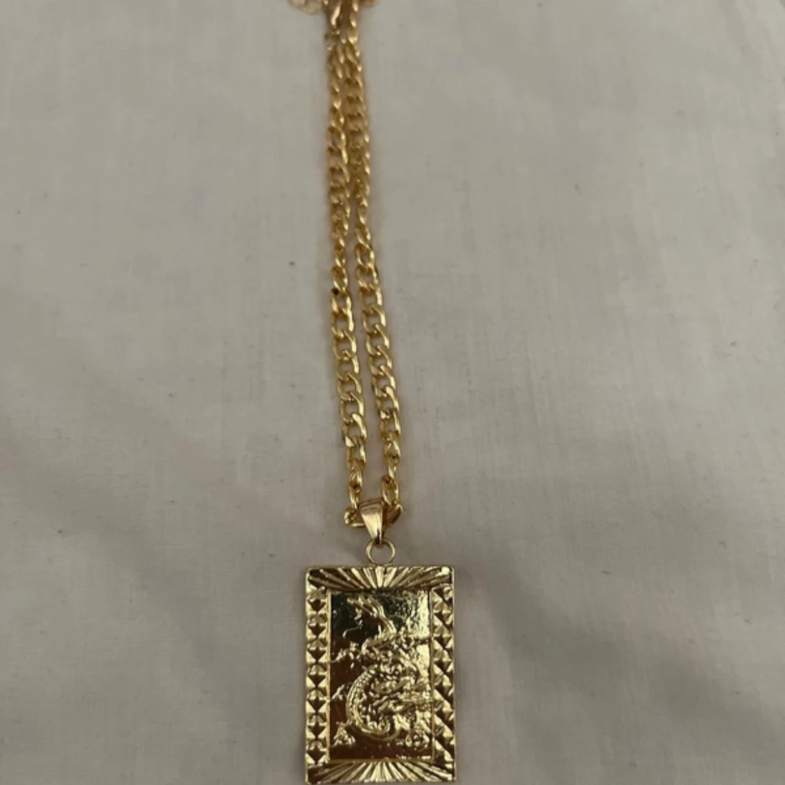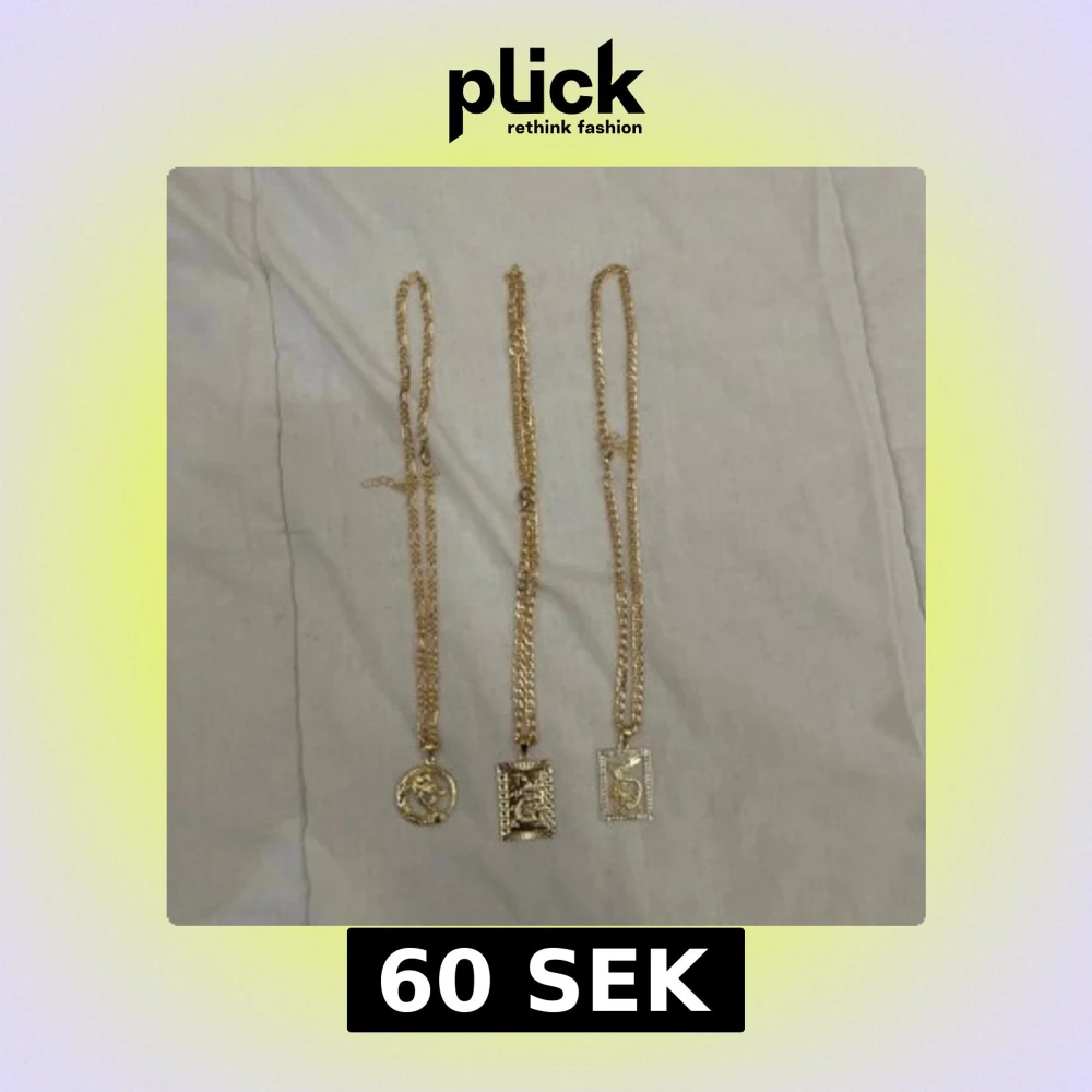 Säljer tre snygga halsband i guldfärg med kedjor och unika drakberlocker. Två av hängen är rektangulära, varav ett har glittriga stenar runt kanten, och det tredje är runt med detaljerad drake. Perfekt accessoar för dig som vill sticka ut.