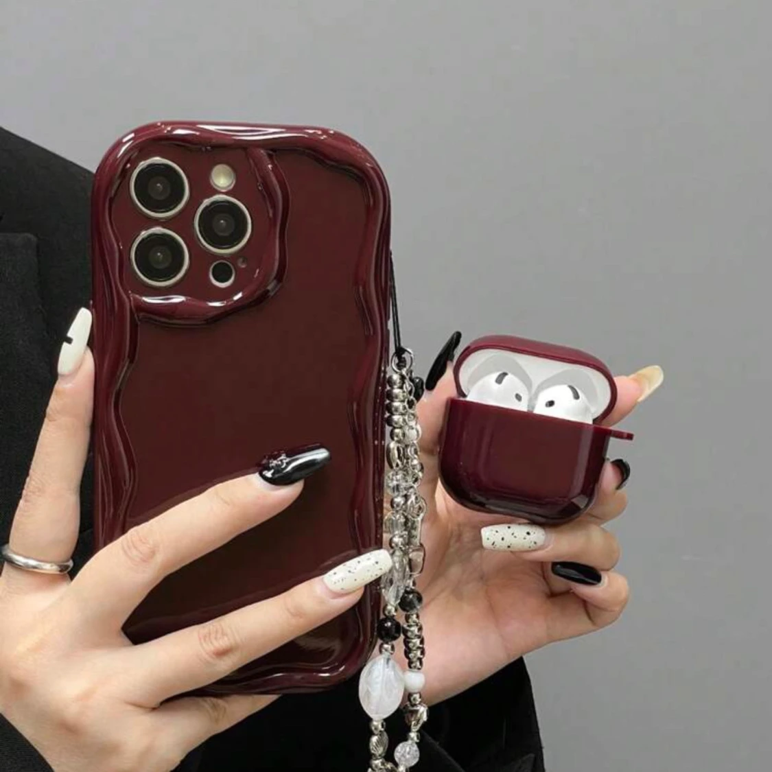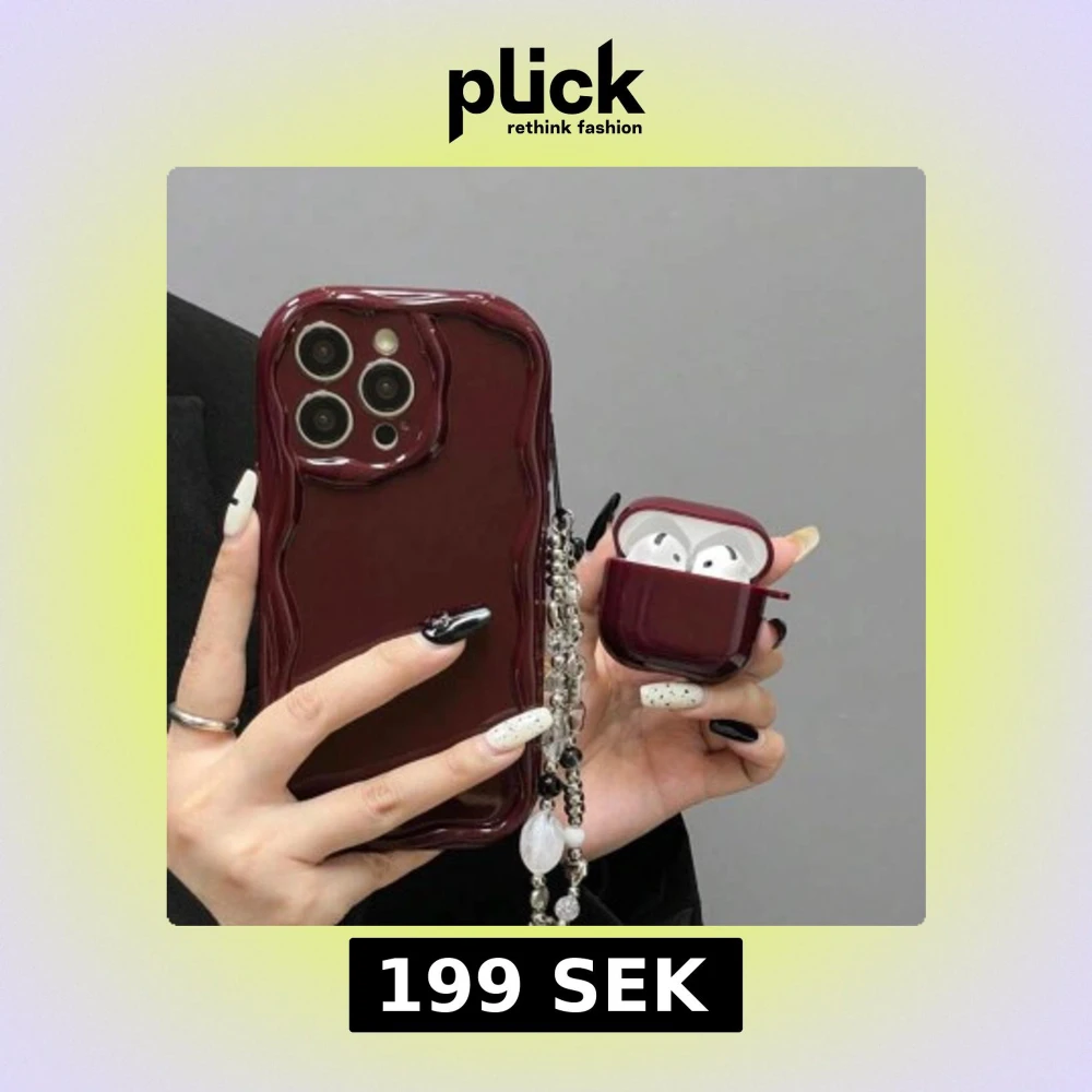 Detta set innehåller både ett mobilskal och ett AirPods-fodral i matchande färg med dekorativ kedja.