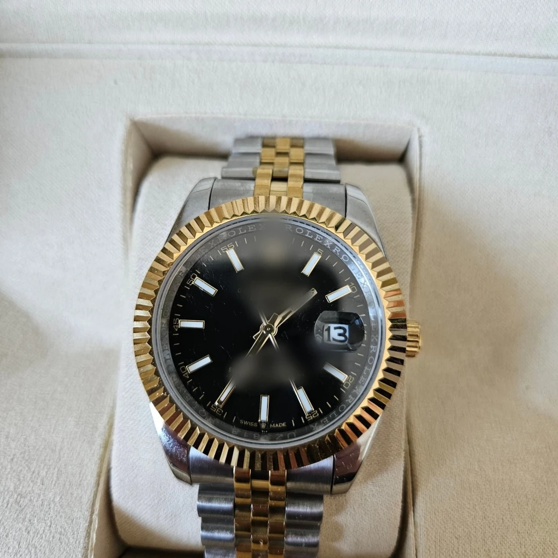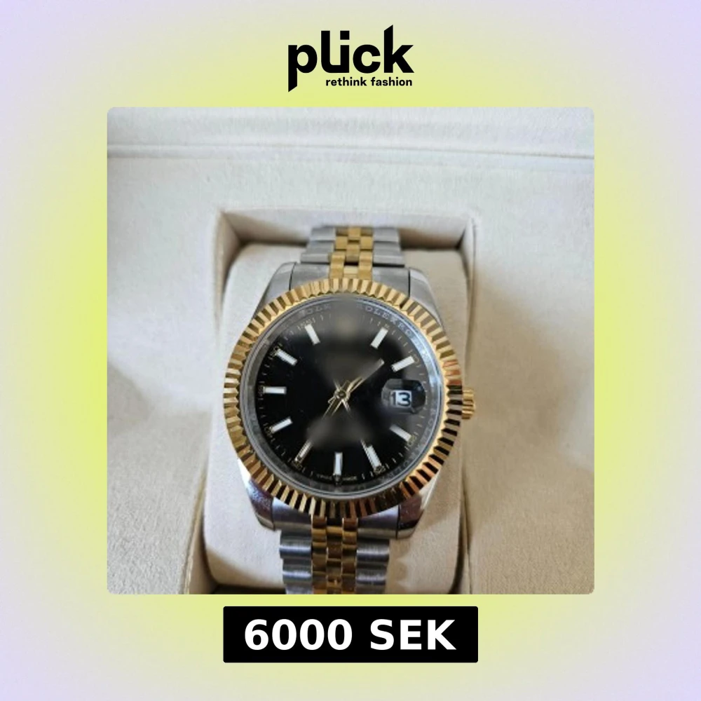 Snygg svart urtavla och datumvisning. Klockan har en rund boett i stål och guld, samt en tvåfärgad länk i silver och guld. Räfflad bezel i guld ger extra lyxig känsla. Perfekt accessoar för dig som gillar klassisk stil med edge.