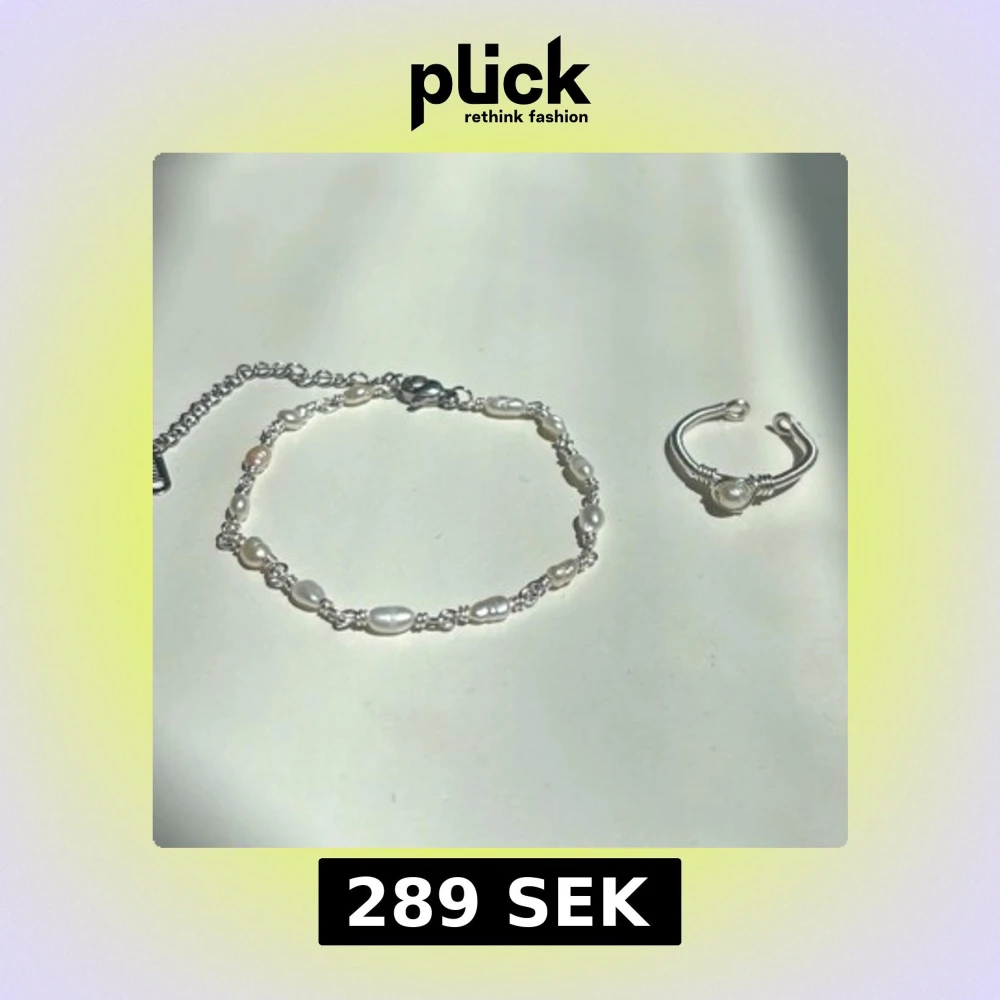 Setet innehåller: ✓ Ett handgjort armband ✓ En justerbar ring Armband: Längd: 16,5 cm + 6,5 cm förlängningskedja Material: Rostfritt stål, äkta sötvattenspärlor Ring: Justerbar storlek Material: Rostfritt stål