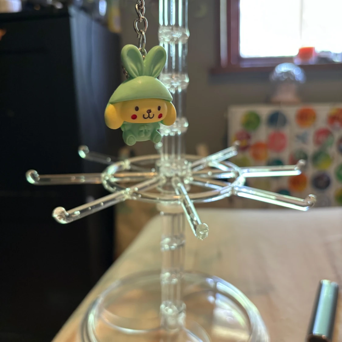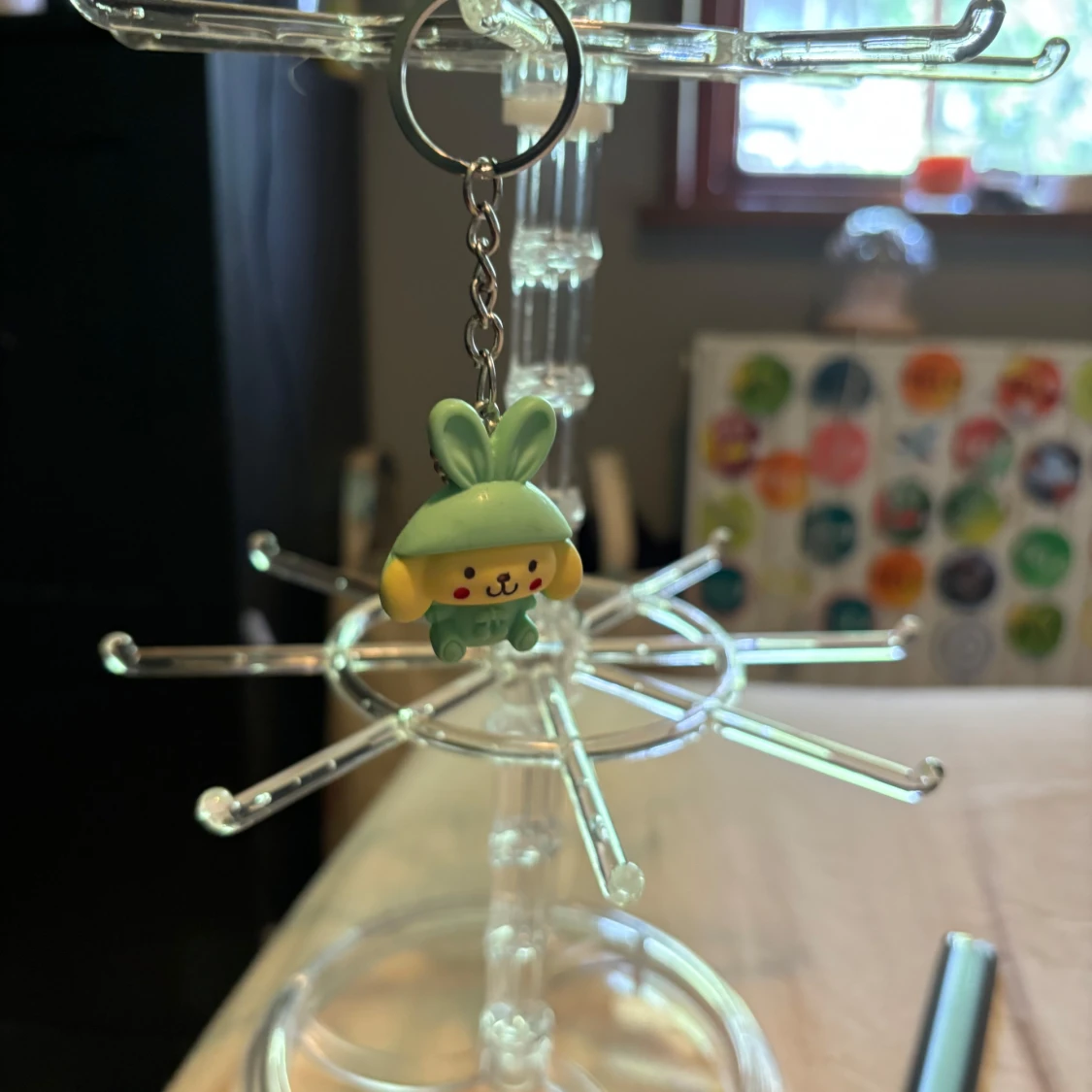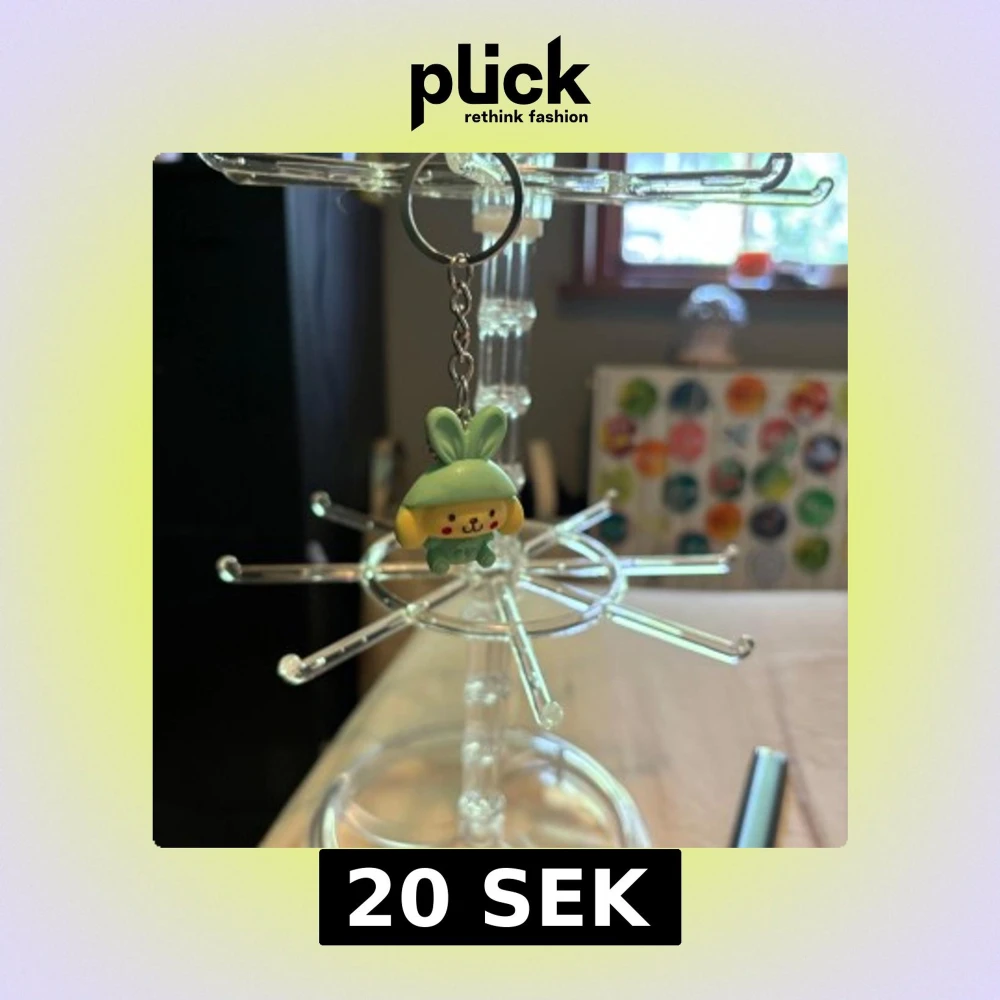 Nyckelring med en gullig figur i form av en gul hund med gröna kaninöron och gröna kläder. Figurerna har röda kinder och ett glatt ansikte, perfekt att hänga på väskan eller nycklarna för en extra söt detalj.