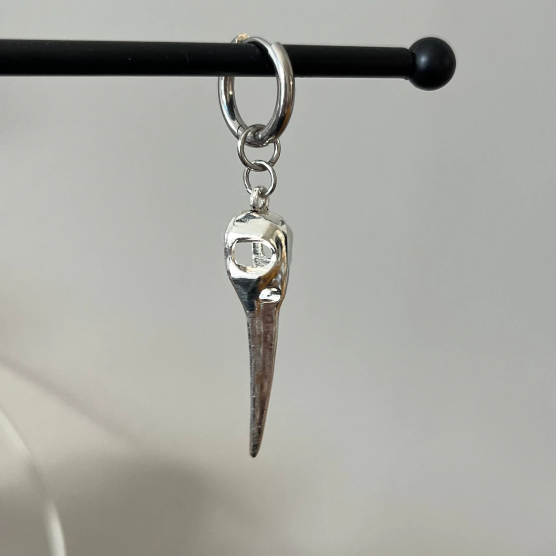 Stilrent silverfärgat örhänge med en unik hängande fågel kranium. Perfekt för att ge en edgy touch till din stil. Örhänget har en slät yta och en enkel ringdesign.
