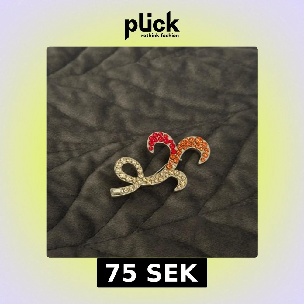 Unik brosch i silvrig metall, dekorerad med gnistrande strass i rött, orange och klara stenar. Snygg, böljande form som sticker ut och ger en cool touch till din outfit. Perfekt accessoar för dig som gillar färg och bling.