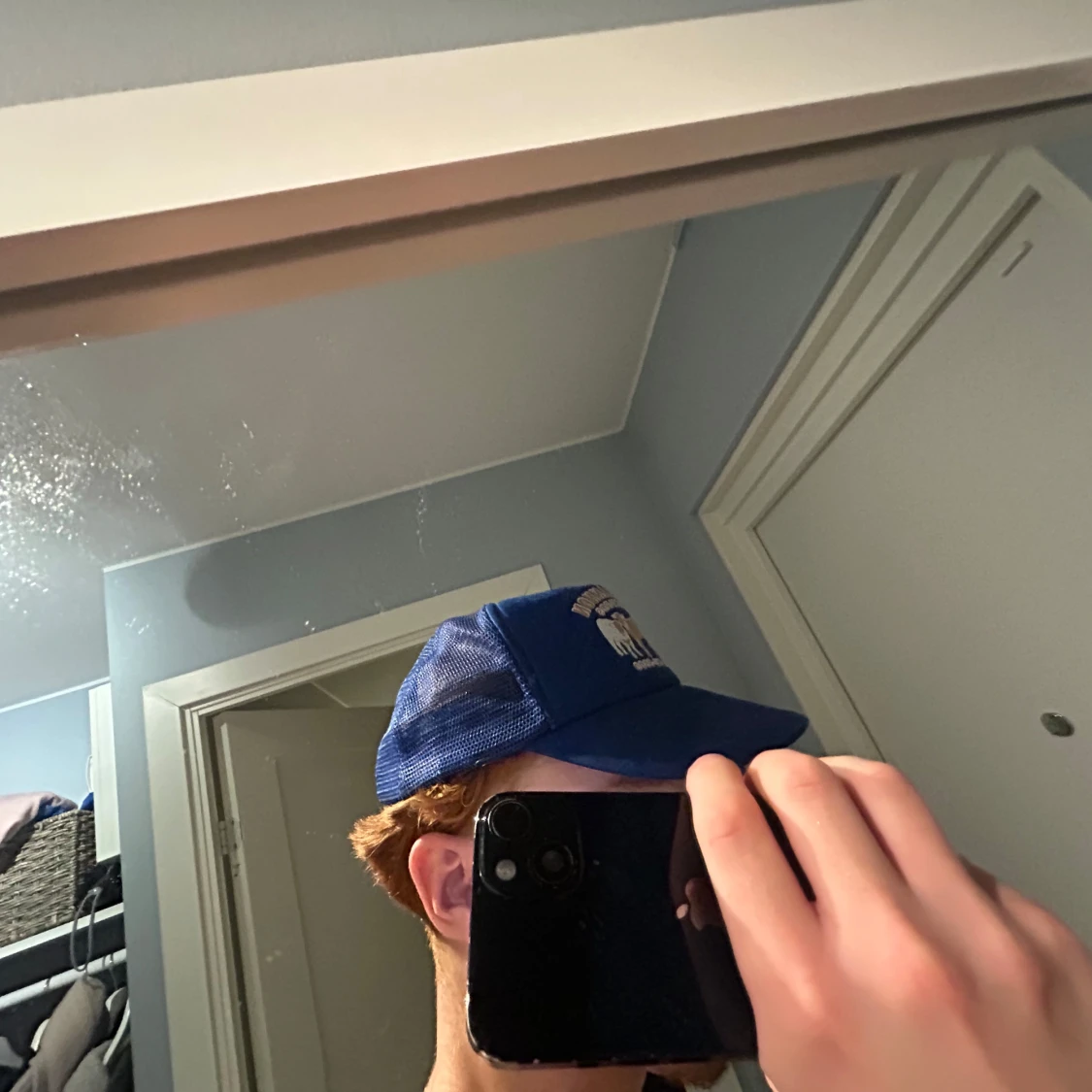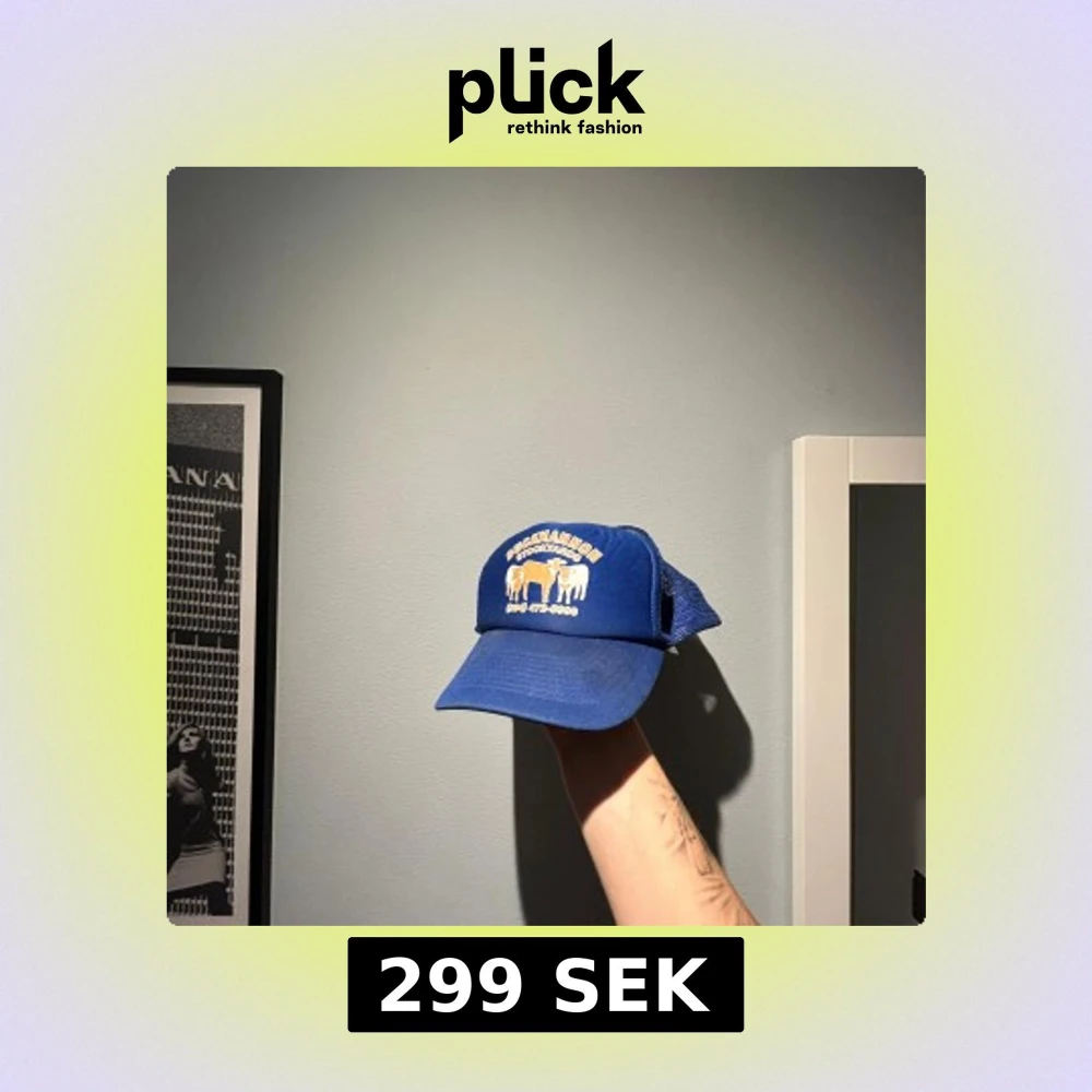 Snygg blå truckerkeps med vit och gul brodyr framtill, där det står Buckhannon Stockyards och har motiv av kor. Kepsen har mesh på sidorna och justerbar baksida.