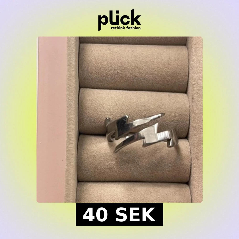 Säljer en unik silverfärgad ring med blixtformad design. Ringen har en öppen justerbar form och glänsande yta som ger en edgy och modern vibe. Perfekt för dig som vill sticka ut med dina accessoarer.