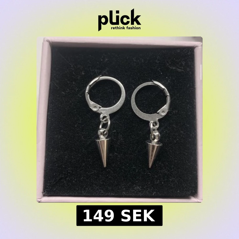 Säljer ett par coola silvriga örhängen med små konformade hängen. De har en enkel ringdesign med en snygg, minimalistisk vibe och passar perfekt för dig som gillar edgy accessoarer.