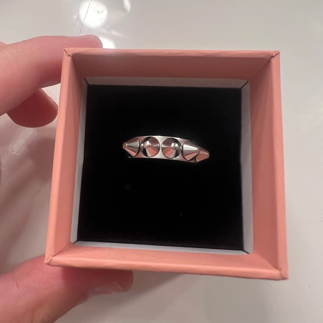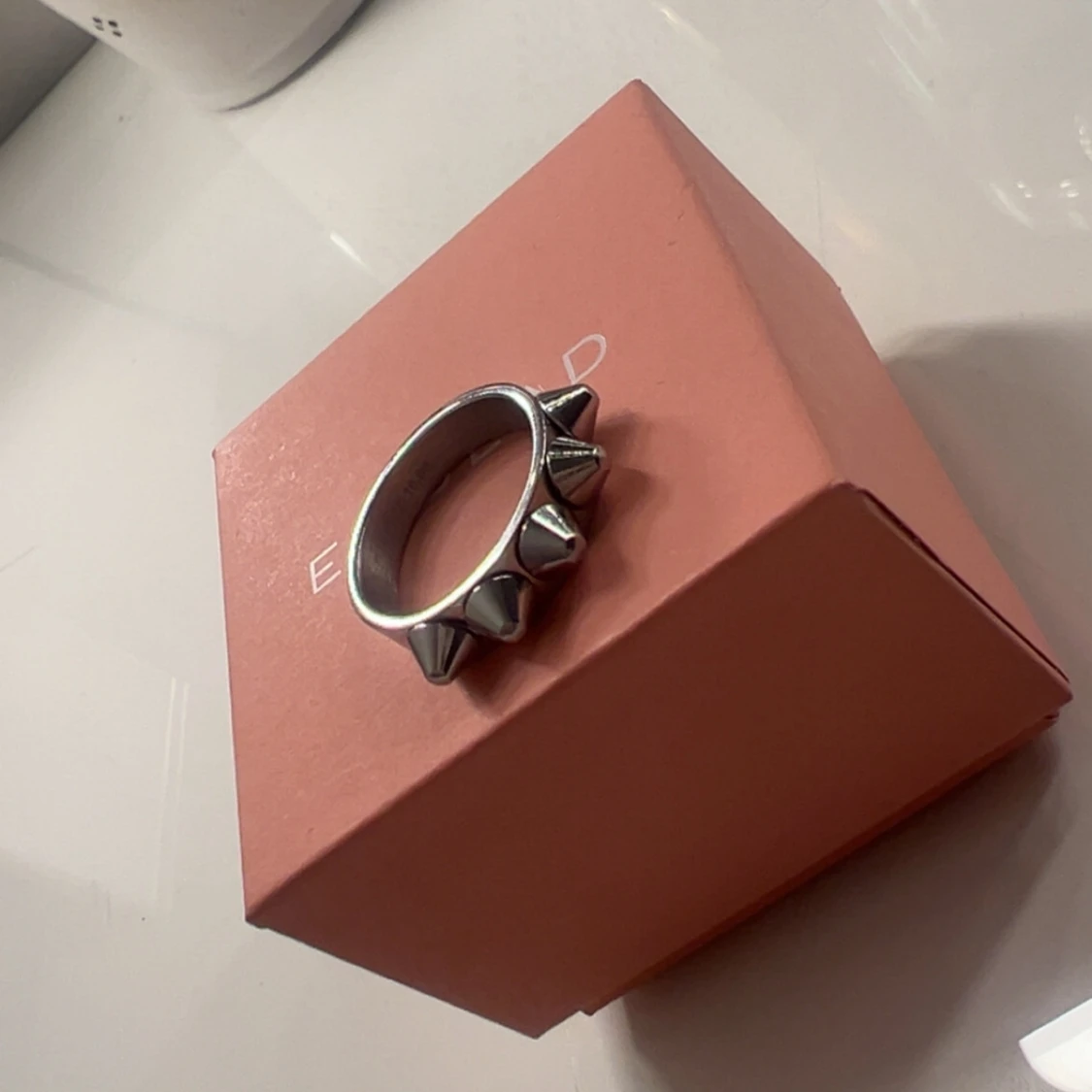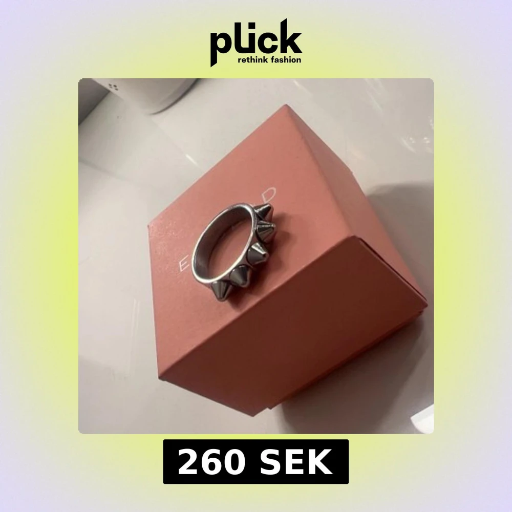 Cool ring i silverfärgad metall med fem konformade nitar runt hela ringen. Perfekt accessoar för dig som gillar edgy och alternativ stil. Ringen har en chunky känsla och sticker verkligen ut på fingret. Från Edblad är i bra skick och inte används förutom provning då den inte passa men var försen att skicka tbx
