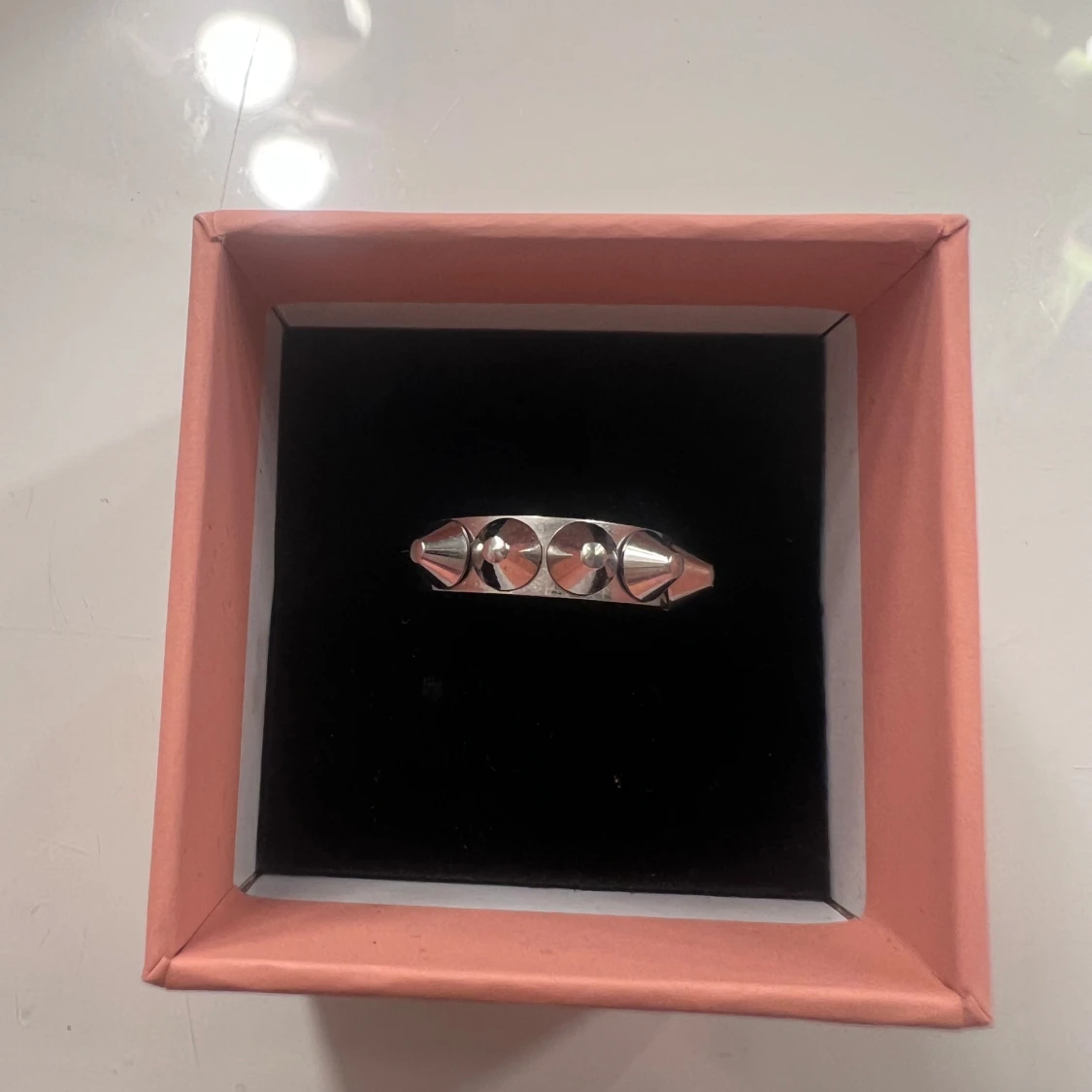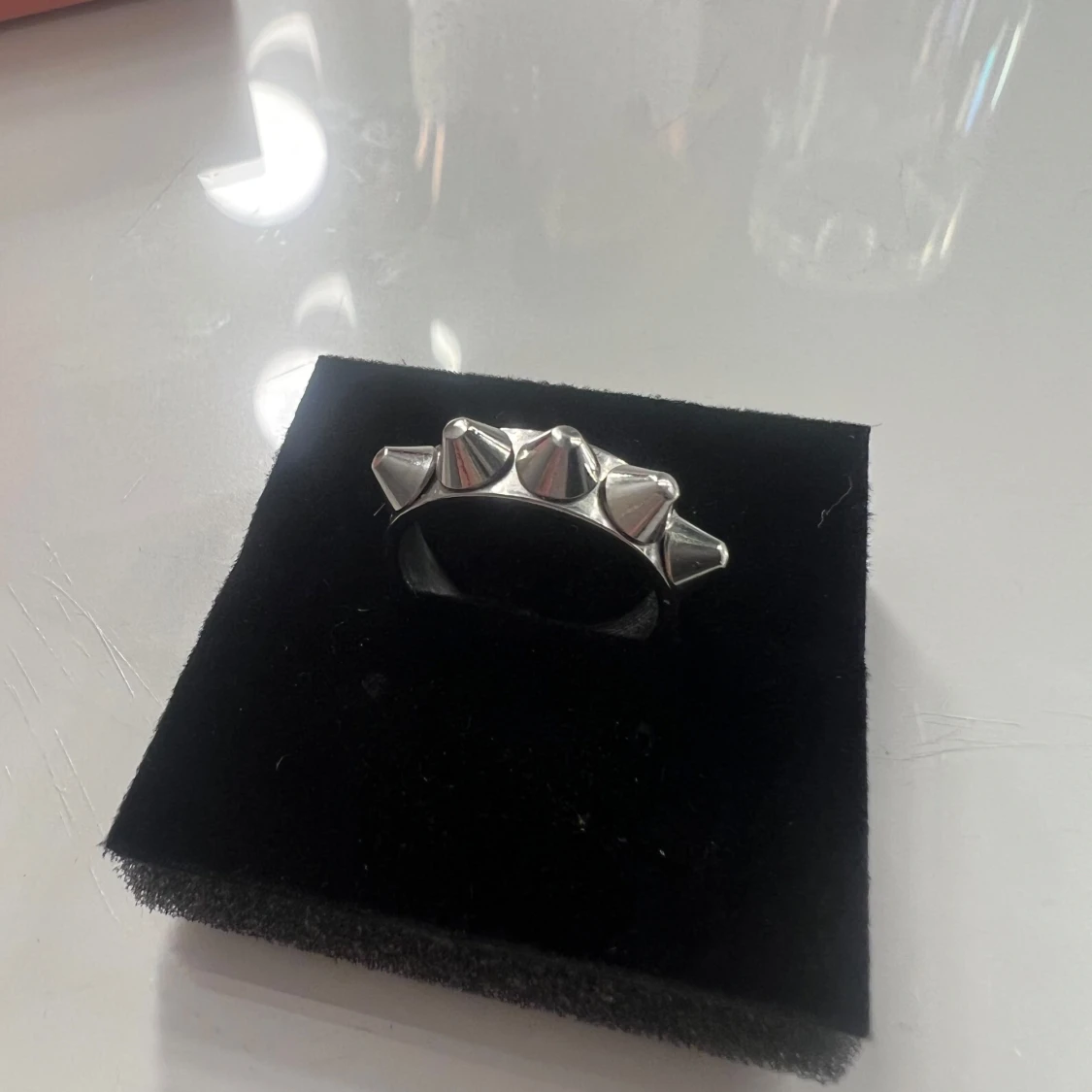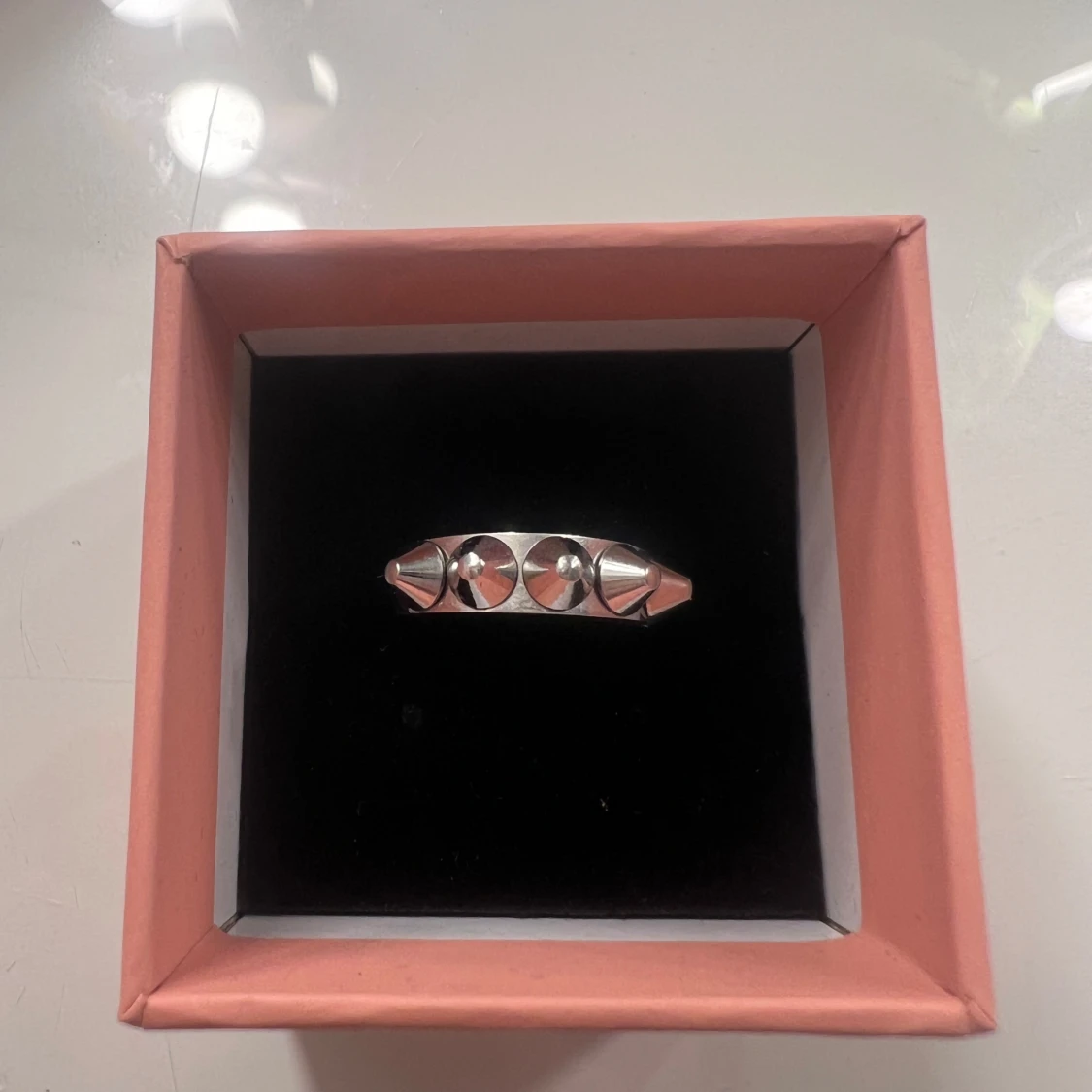 Cool ring i silverfärgad metall med fem konformade nitar runt hela ringen. Perfekt accessoar för dig som gillar edgy och alternativ stil. Ringen har en chunky känsla och sticker verkligen ut på fingret. Från Edblad är i bra skick och inte används förutom provning då den inte passa men var försen att skicka tbx