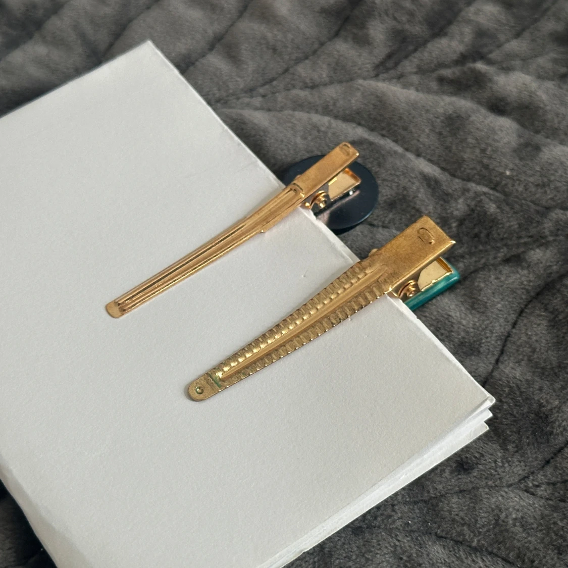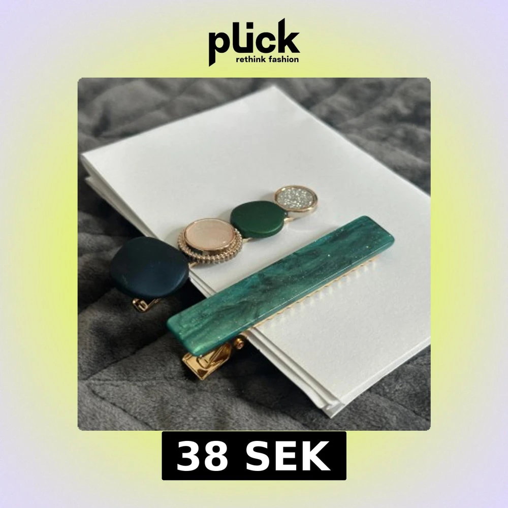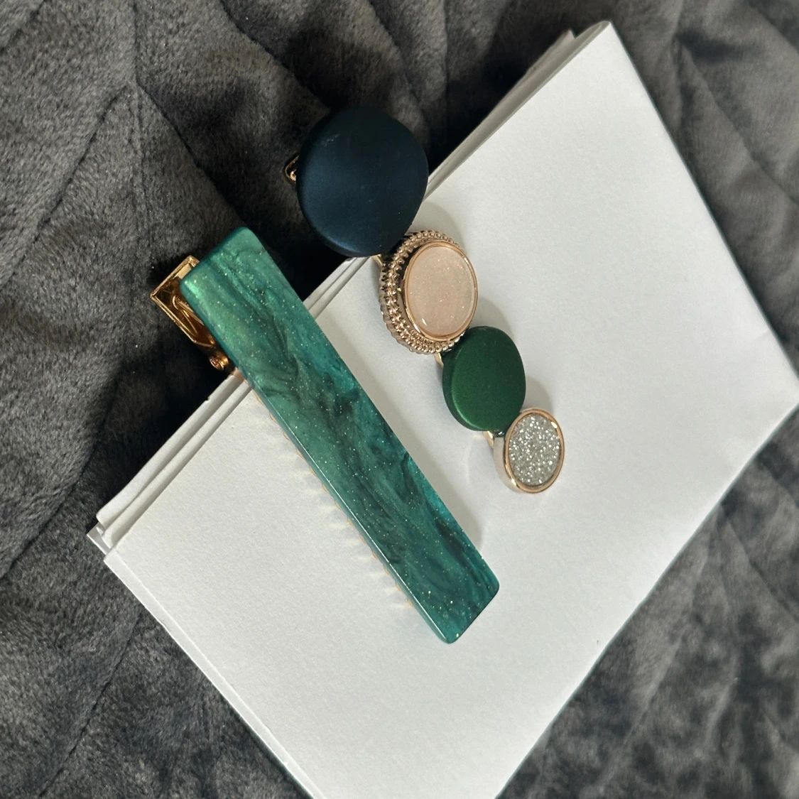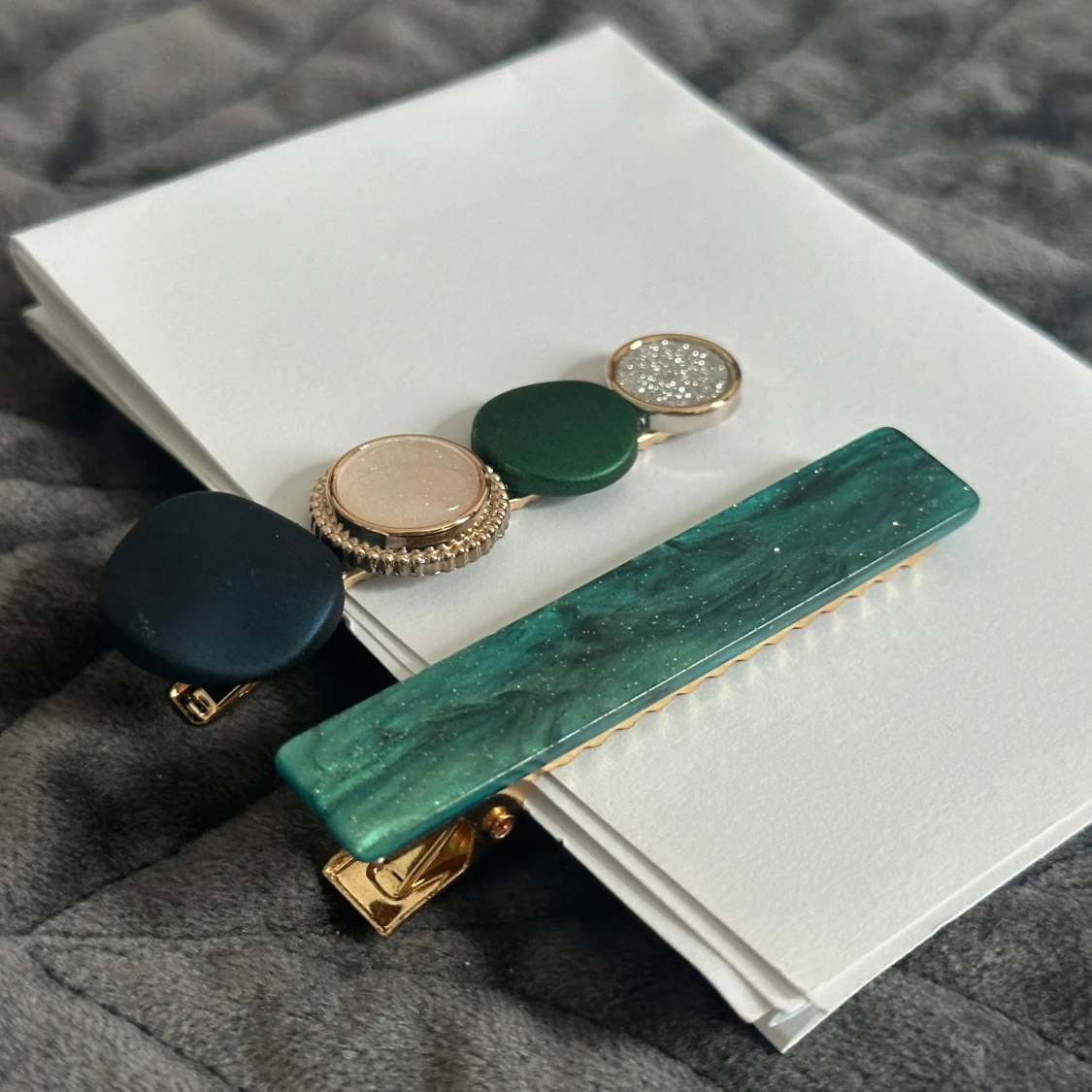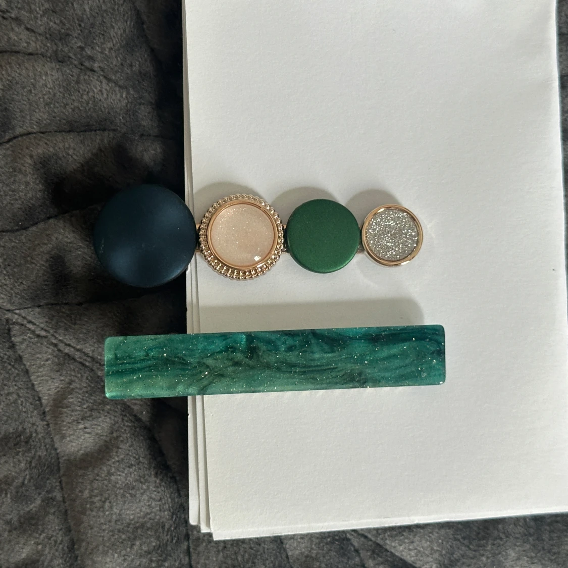 Säljer två snygga hårspännen – ett med fyra runda dekorationer i mörkblått, grönt, beige och glittrigt silver, infattade i guldfärgade detaljer, samt ett rektangulärt spänne i marmorerad grön nyans med guldklämma. Perfekt för att lyfta din look.