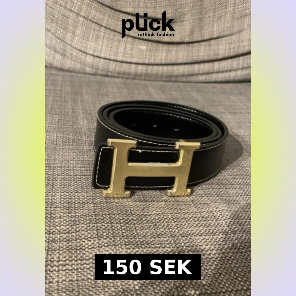 Stilrent svart läderbälte från H med ikoniskt H-format spänne i guldmetall. Bältet har vita kontrastsömmar längs kanterna och ger en lyxig touch till din outfit. Perfekt accessoar för dig som gillar exklusiva detaljer.