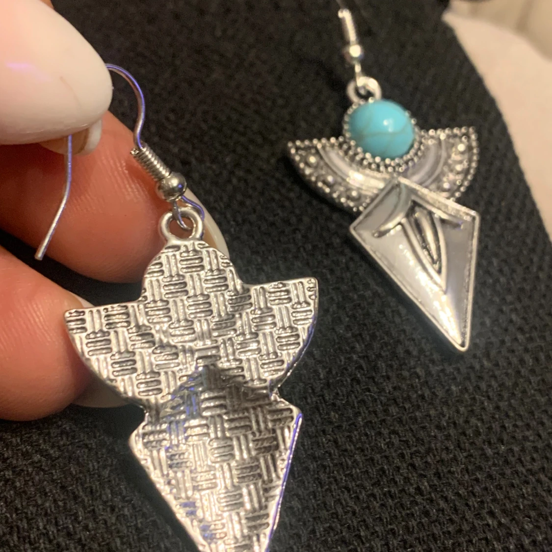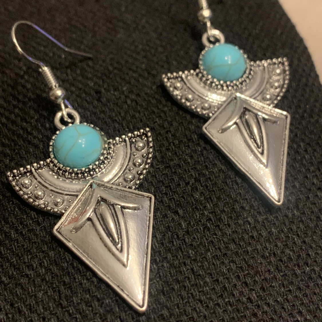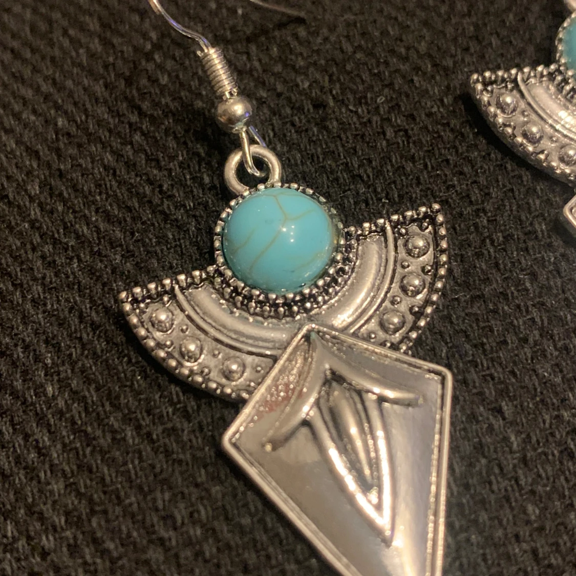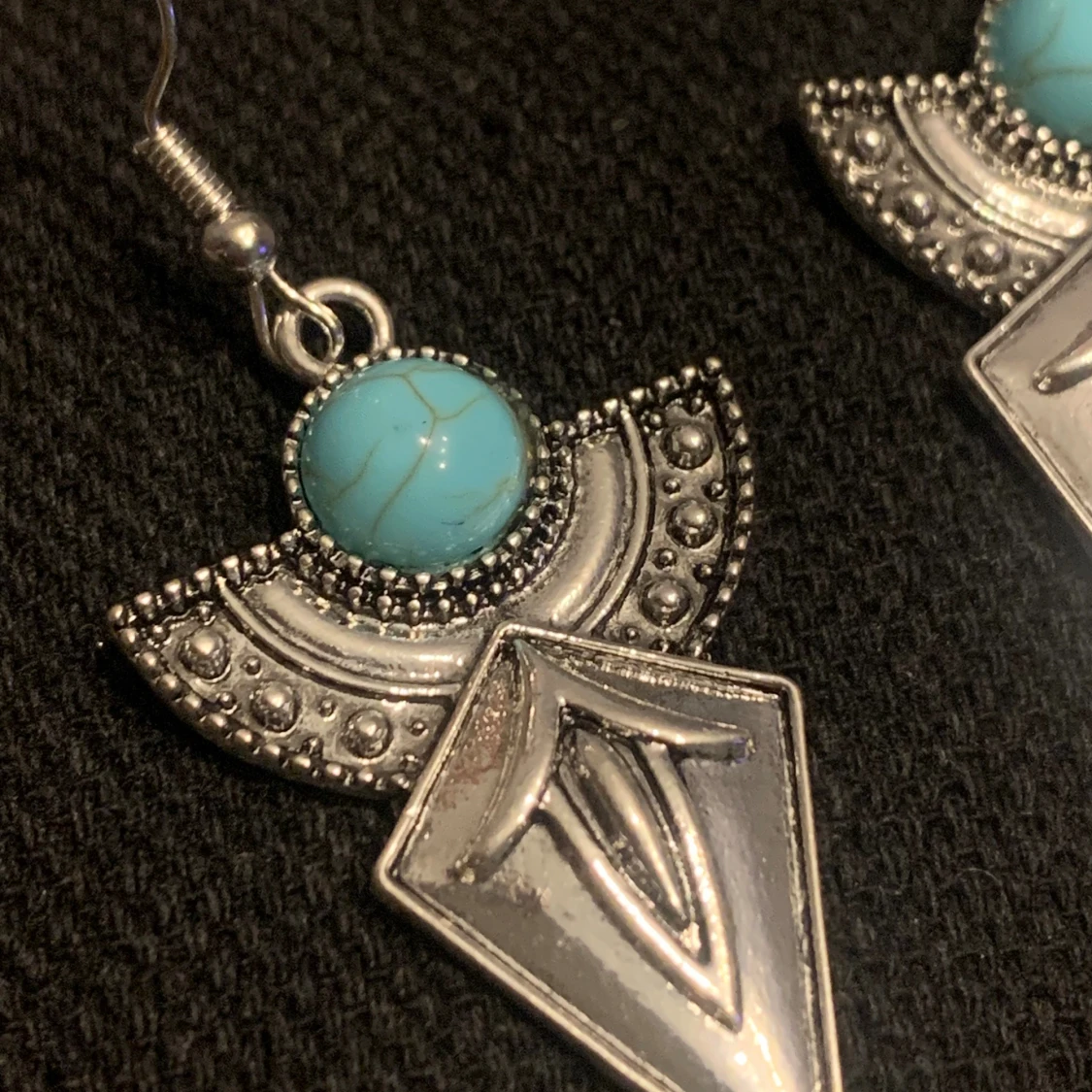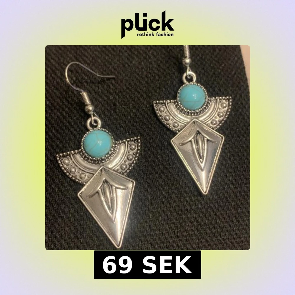 Unika örhängen i silverfärgad metall med geometrisk form och en rund turkos sten upptill. Halvcirkelformad dekoration med små prickar och en spetsig, graverad diamantformad del. Perfekta för dig som gillar boho eller statement-smycken.