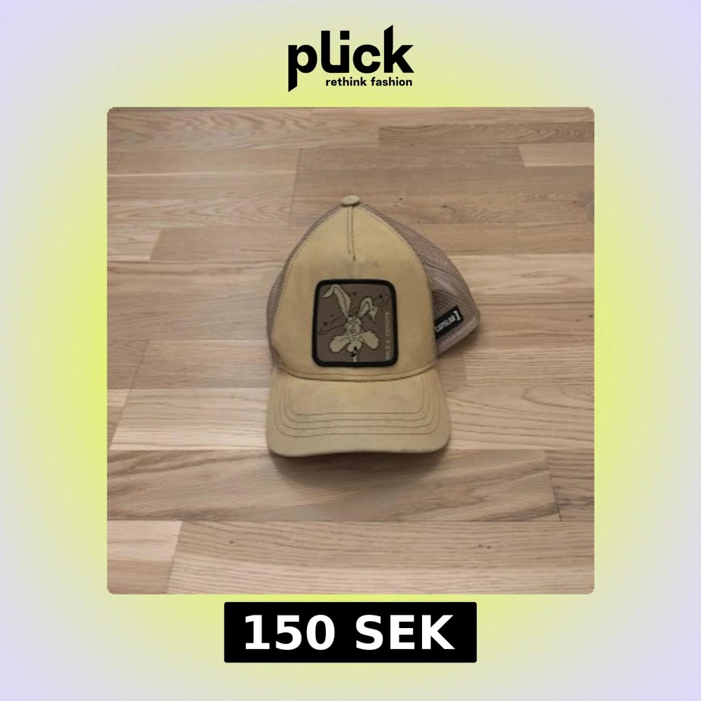 Säljer en beige keps från Capslab med Looney Tunes-tryck av Wile E. Coyote framtill. Kepsen har mesh-bakstycke i ljusbrun polyester och justerbar snapback. Framsidan är i bomull och kepsen har böjd skärm. Perfekt för dig som gillar tecknade motiv och streetstyle.