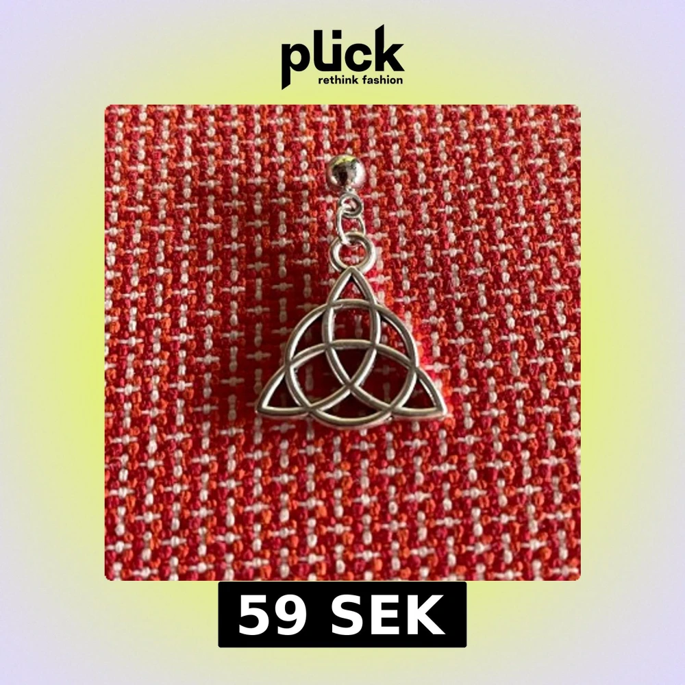 Unikt örhänge i silverfärgad metall med en öppen keltisk knut-design. Hängsmycket har en snygg geometrisk form och sitter fast i en liten kula. Perfekt för dig som gillar symboliska och stilrena smycken.