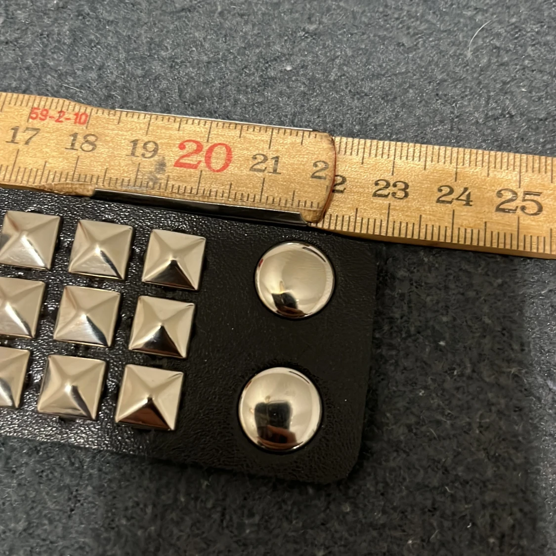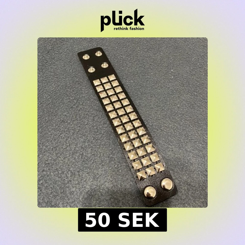 Coolt svart armband med tre rader silvriga pyramidnitar och tryckknappar för enkel stängning. Bred design som ger en edgy vibe och passar perfekt till streetstyle eller rockiga outfits. Materialet är konstläder och nitarna är i metall. Snygg accessoar för dig som gillar att sticka ut.