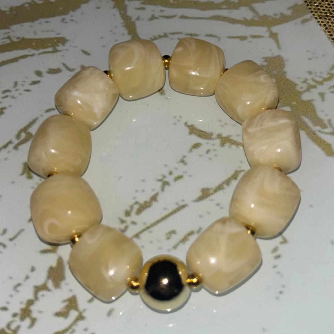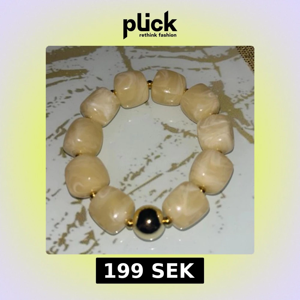 Stilrent armband med stora, fyrkantiga pärlor i beige nyans och en kontrasterande svart och guldig rund pärla fick på födelsedags present men inte min stil har inte ens testat den på