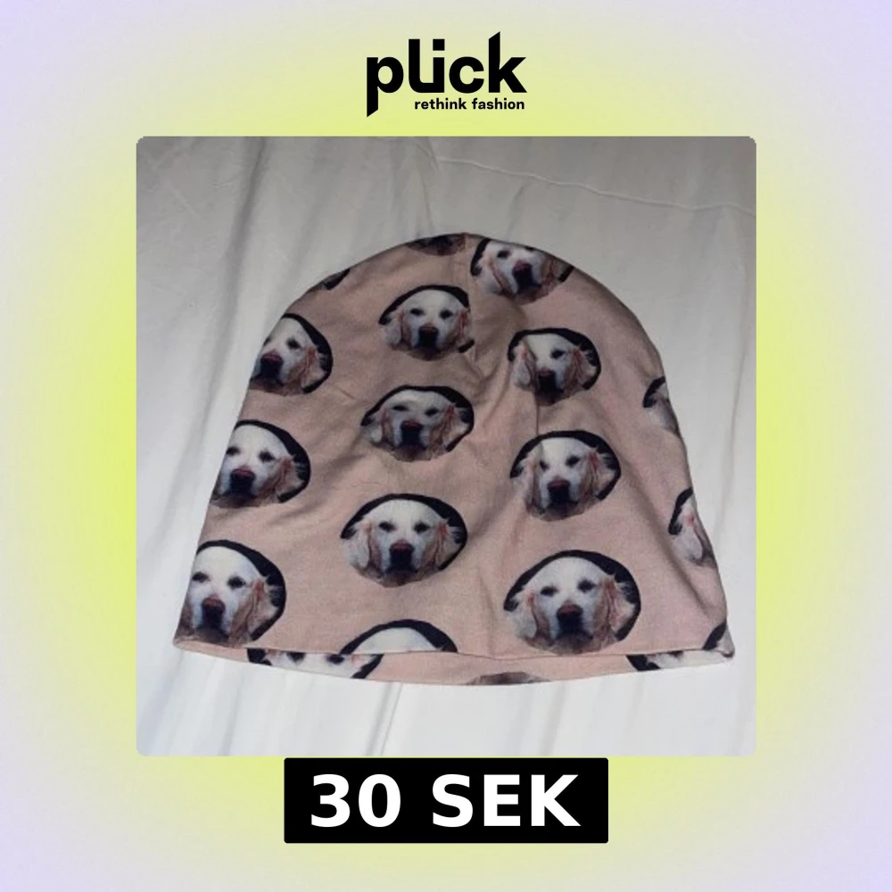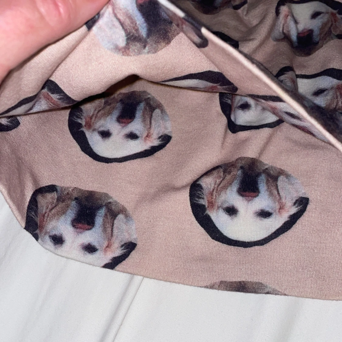 Säljer en beige mössa med tryck av söta hundansikten över hela tyget. Mössan är mjuk och stretchig, perfekt för att hålla värmen. Passar dig som vill sticka ut med en unik accessoar och älskar hundar.