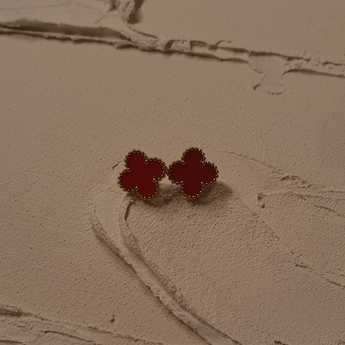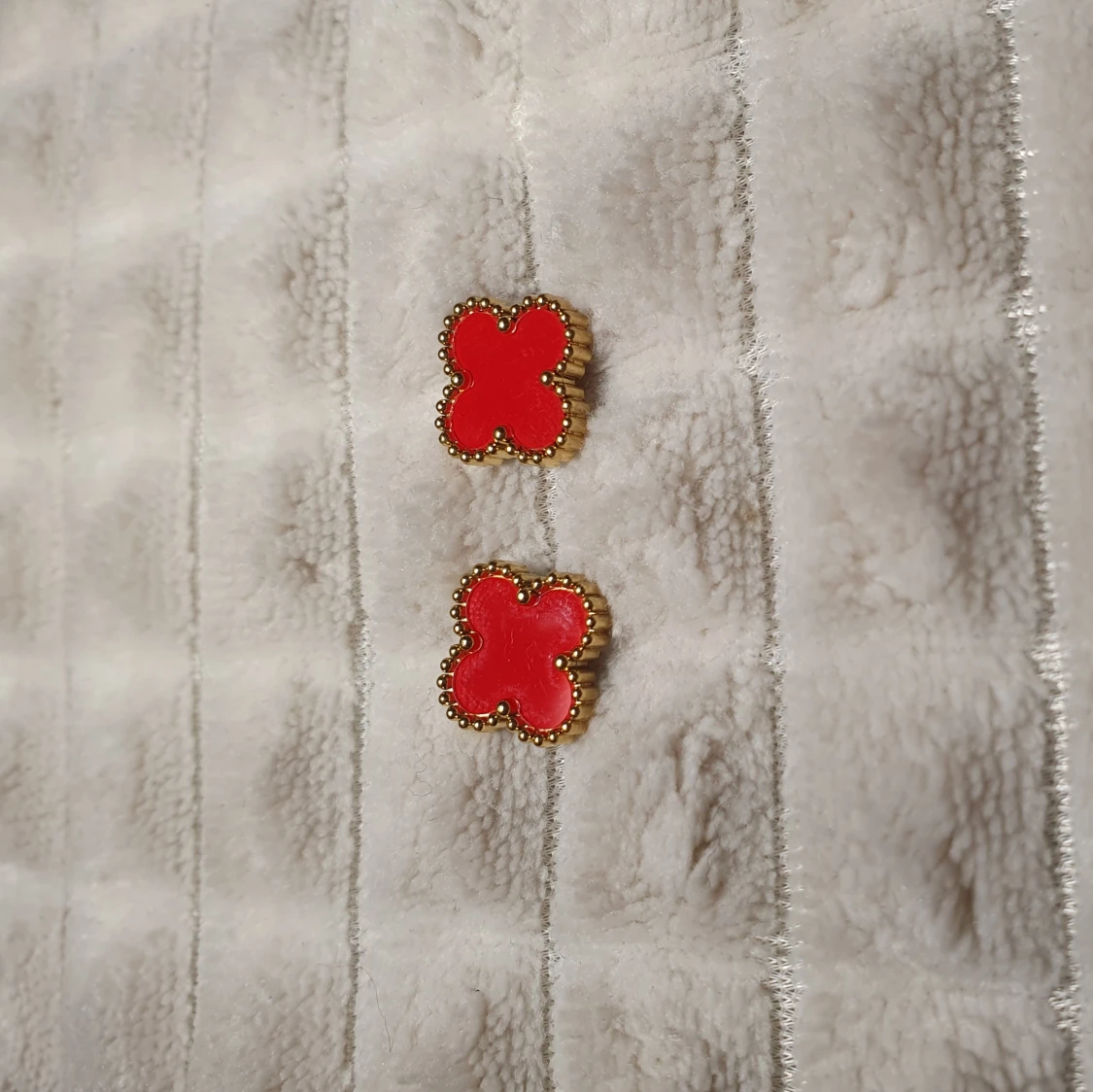 Snygga röda örhängen i form av fyrklöver med en fin guldfärgad kant. Perfekta för att ge en färgklick till din outfit. Passar både till vardag och fest.