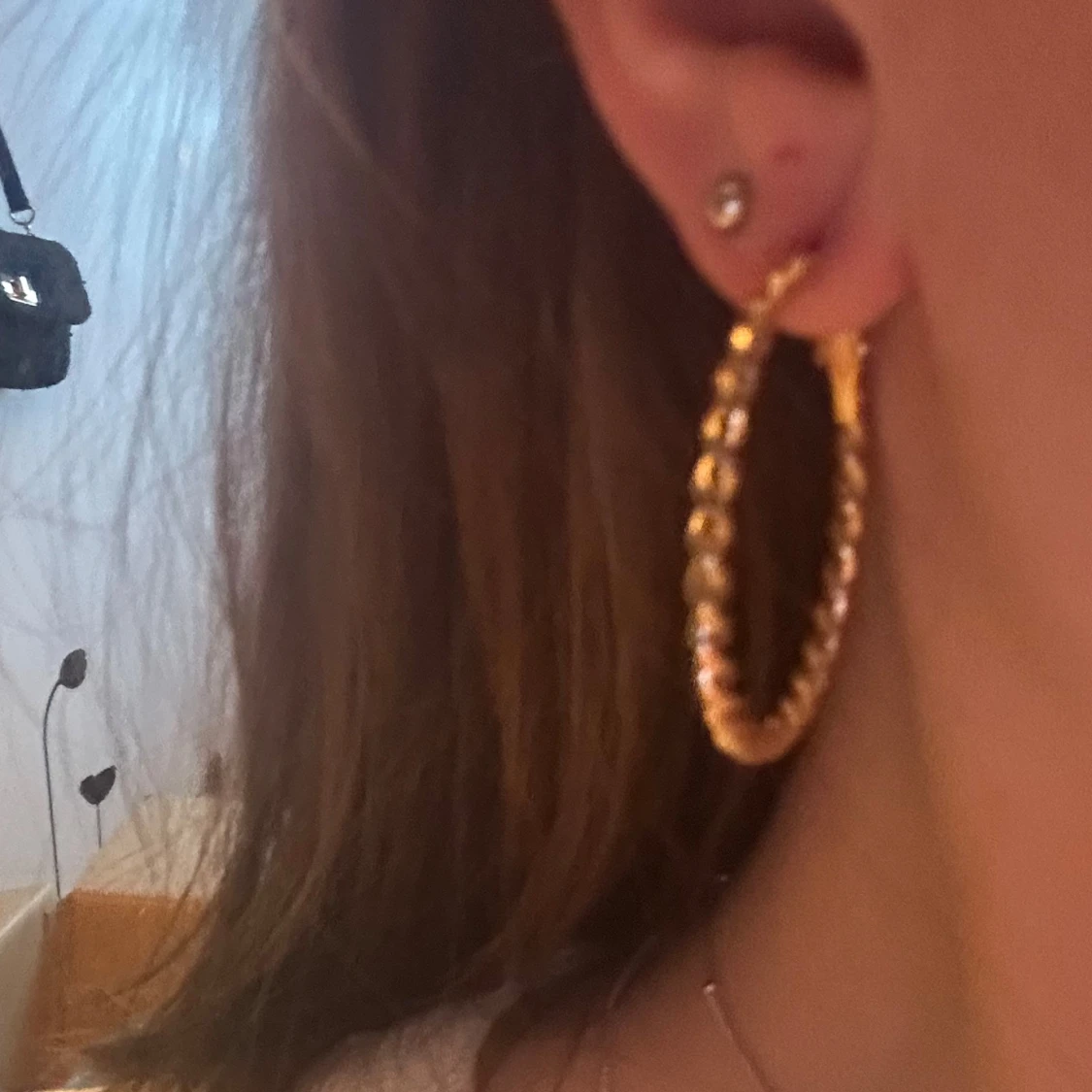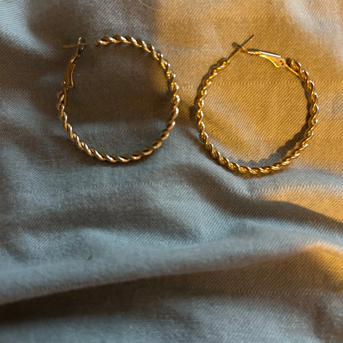 Snygga guldiga örhängen med en vriden design. Perfekta för att ge en elegant touch till din stil. De är runda och har en enkel låsmekanism för säker användning.