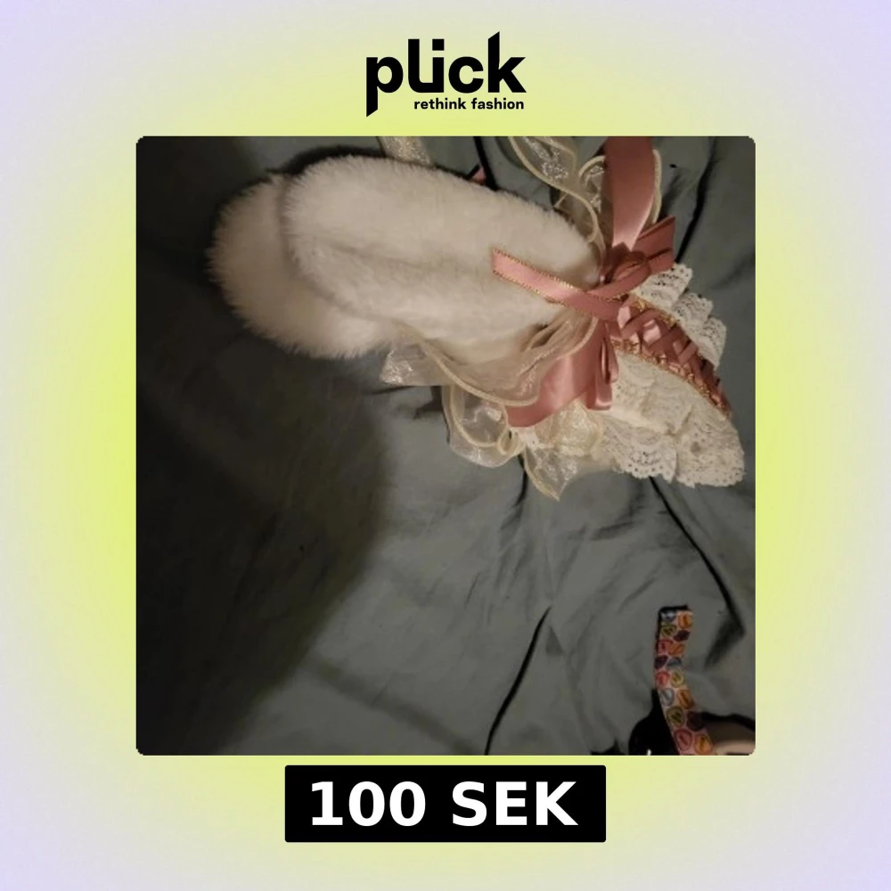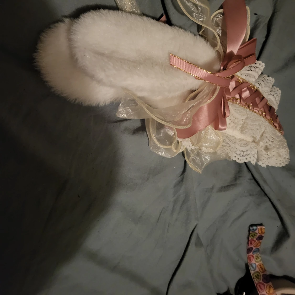 Supergulliga vita huvudbonad med fluffig ovandel, dekorerade med bred spets, rosa satinband i korsmönster och stora rosetter med gulddetaljer. Perfekta för dig som gillar en söt och romantisk stil.