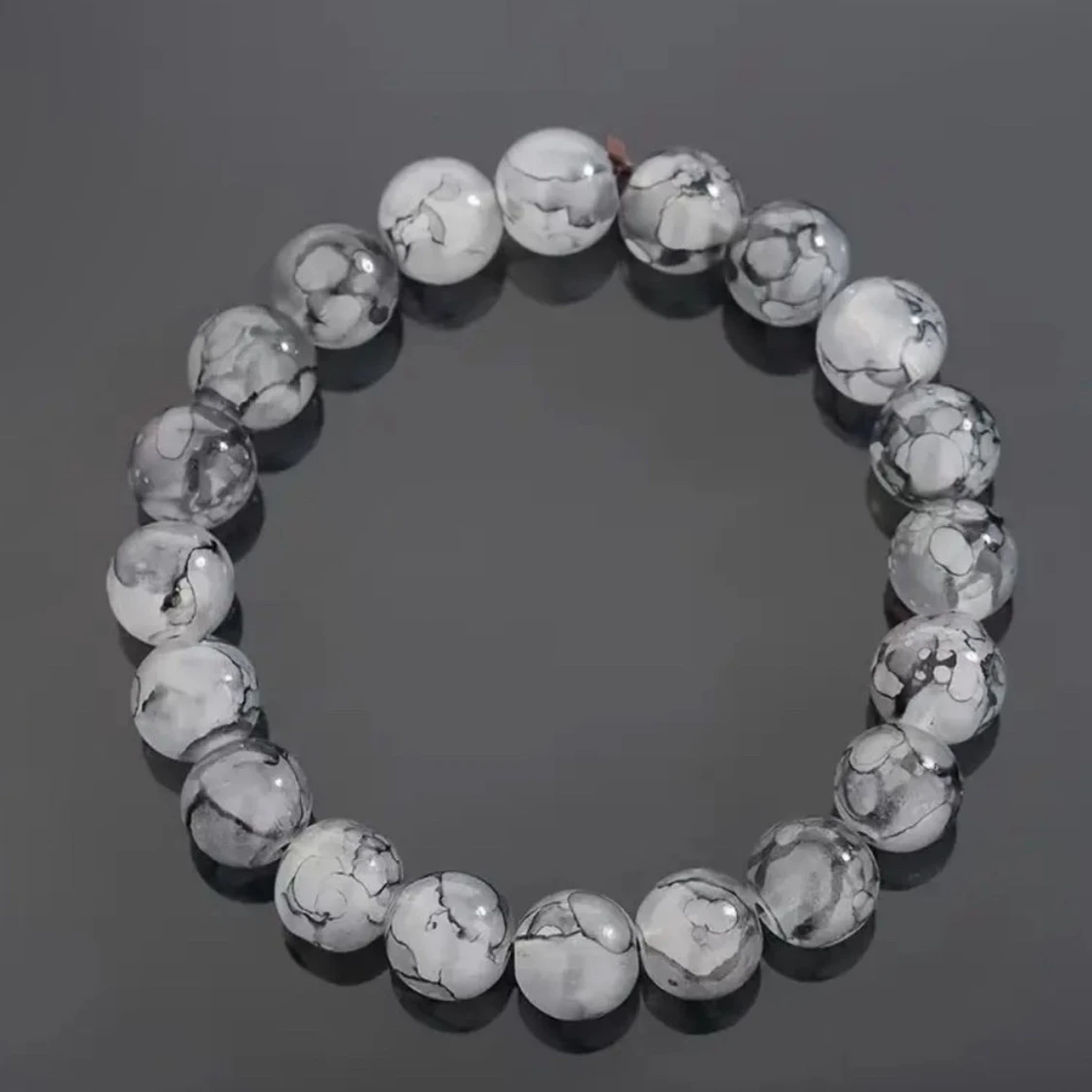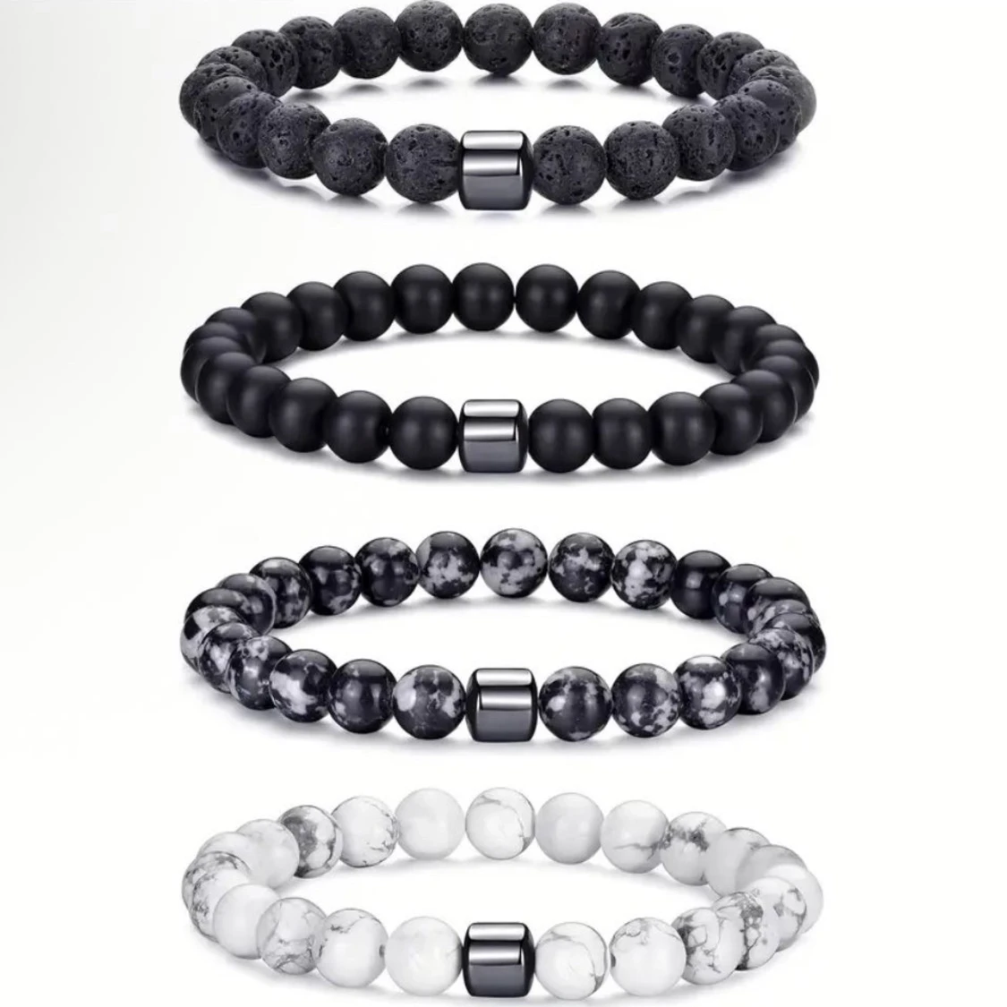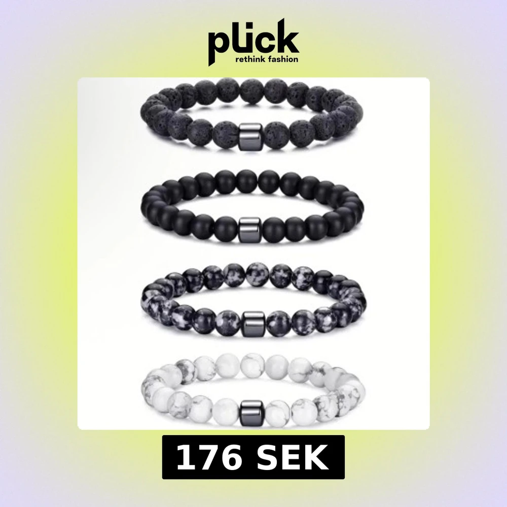 Säljer ett set med fyra coola pärlarmband i olika färger och mönster. Armbanden har runda pärlor i svart lava, matt svart, marmorerad svartvit och vit marmor. Varje armband har en metallisk detalj i mitten som ger extra edge. Perfekt för dig som gillar minimalistisk och modern stil.