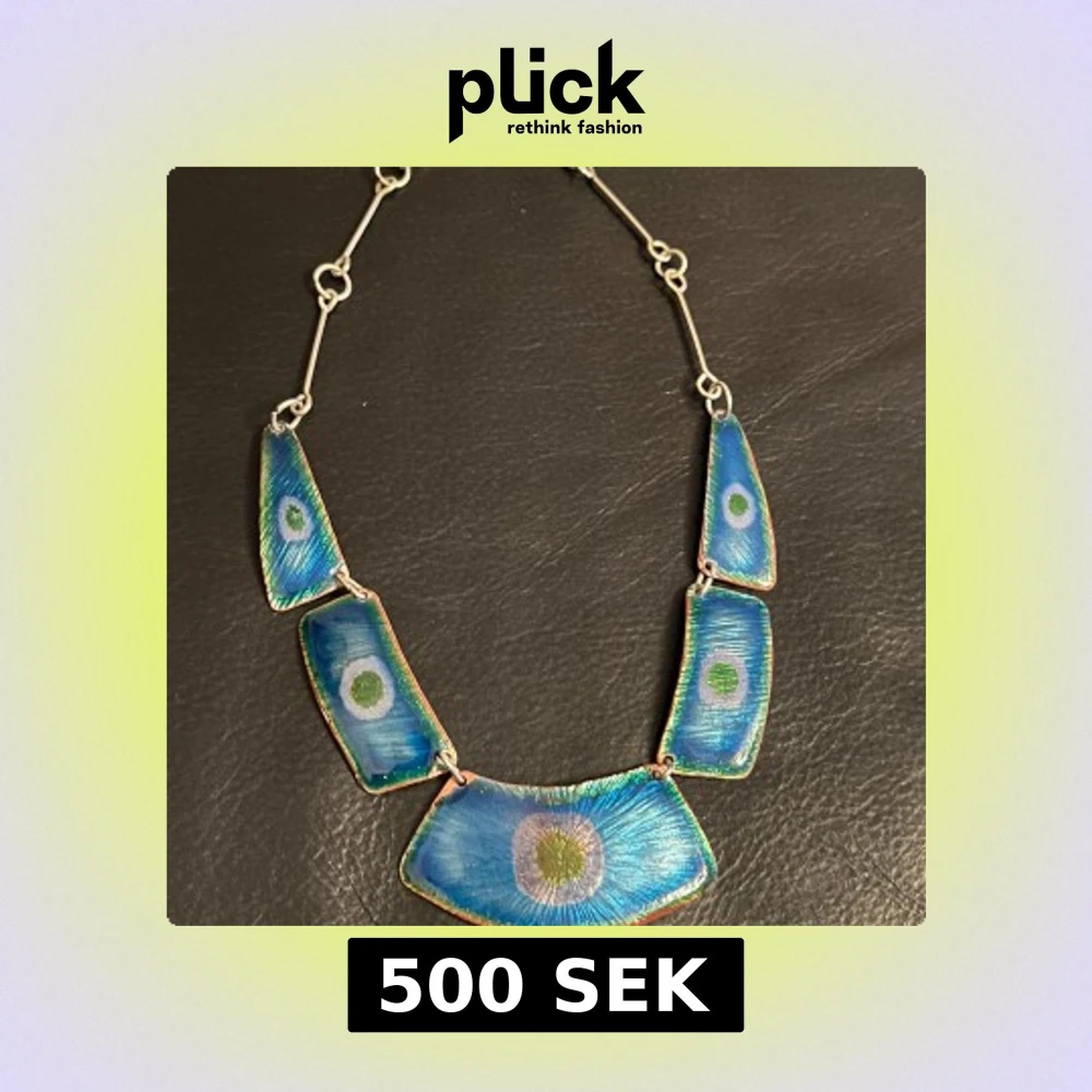Säljer ett unikt vintage halsband med stora blå emaljerade plattor i abstrakt design. Plattorna har en vacker blå färg med cirkulära mönster i grönt och vitt. Halsbandet är handgjort och signerat på baksidan.