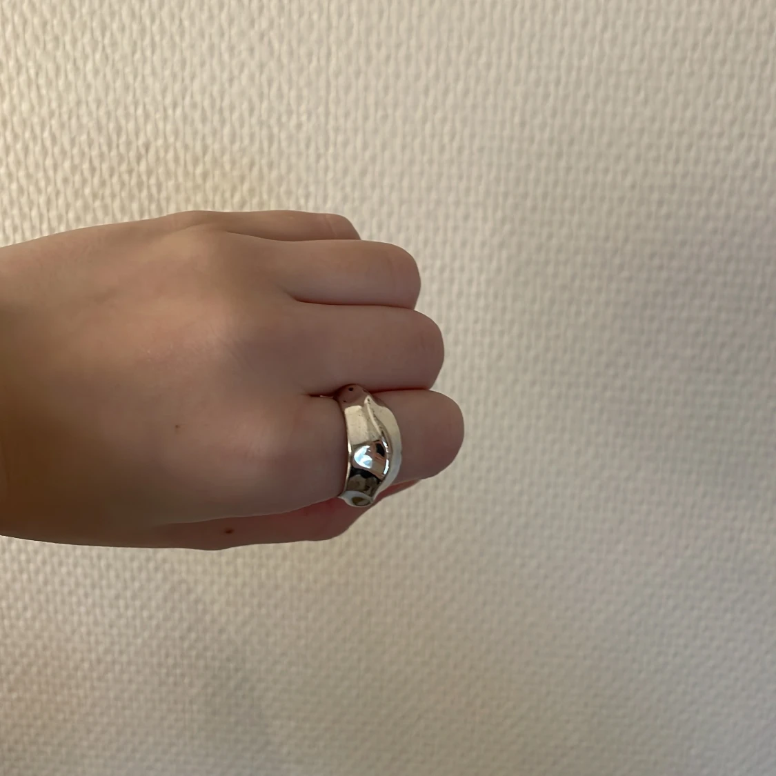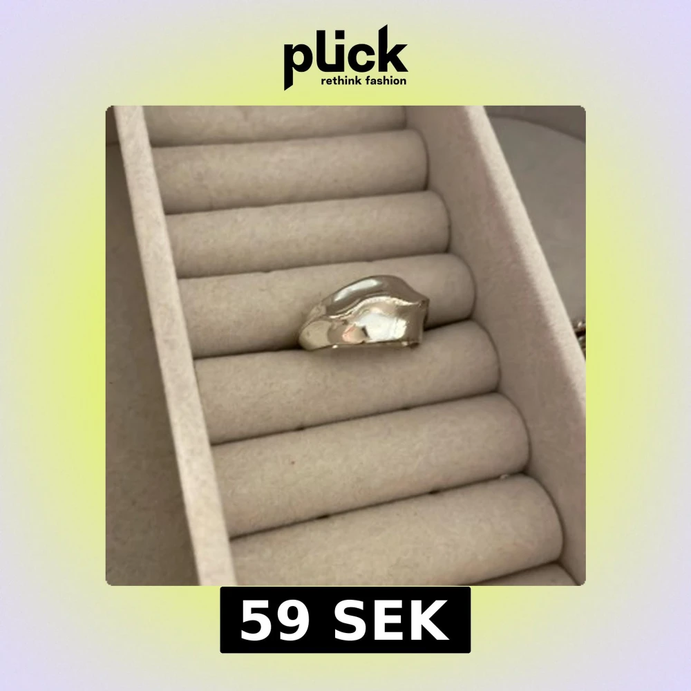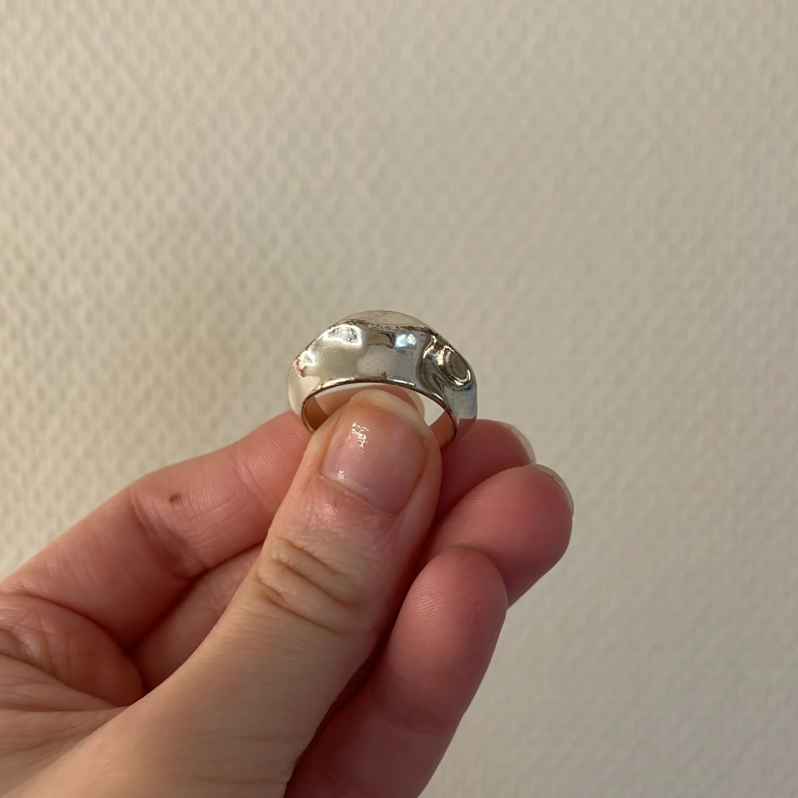 Ringen ser ut att vara lite guppig vilket gör den super fin och unik? Om det ser ut som rost på någon av bilderna så är det inte det utan ringen reflekterar bara min hy🥹