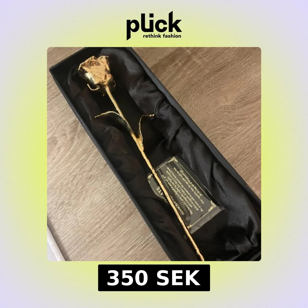 Unik ros doppad i 24K guld, levereras i elegant svart presentask. Perfekt som exklusiv gåva eller dekoration. Rosens naturliga form bevarad under ett lager av äkta guld för en lyxig känsla.
