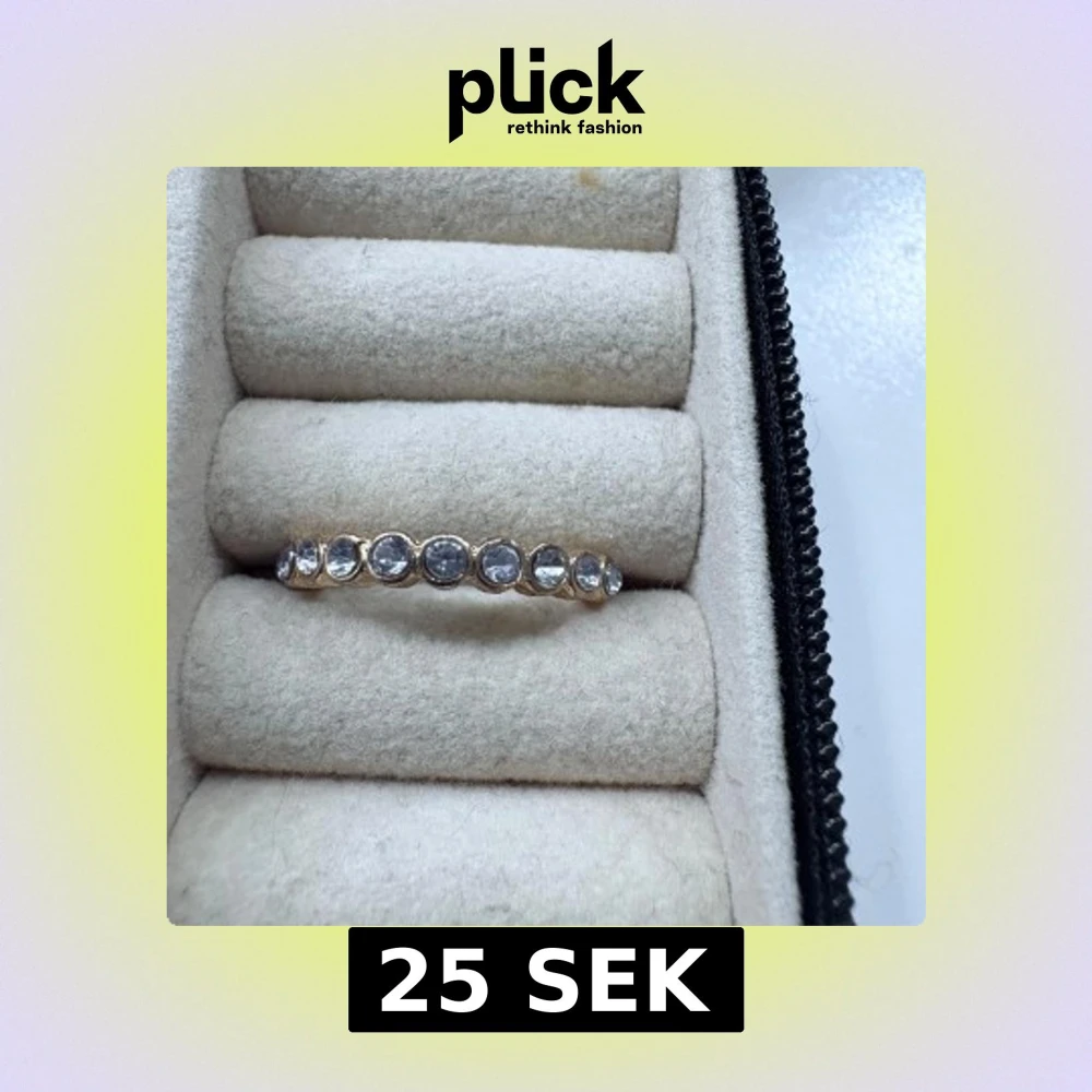 Säljer en snygg guldfärgad ring med infattade klara stenar runt hela ringen. Ringen har en unik, räfflad design på sidorna som ger den extra karaktär. Perfekt för dig som gillar smycken som sticker ut lite extra.