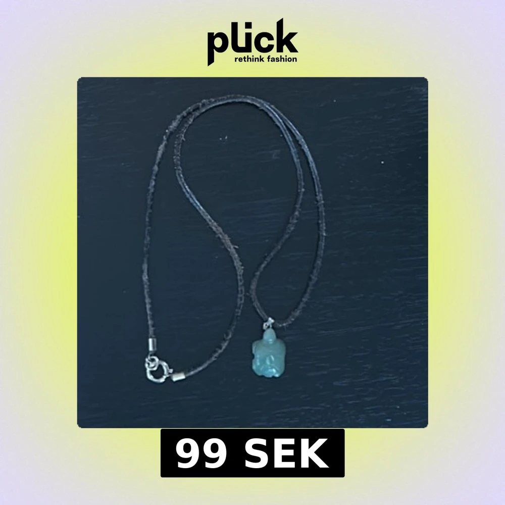Säljer ett halsband med ett grönskimrande sköldpaddshänge i sten. Hängsmycket sitter på ett svart snöre med metallspänne. Perfekt för dig som gillar unika och naturinspirerade smycken.