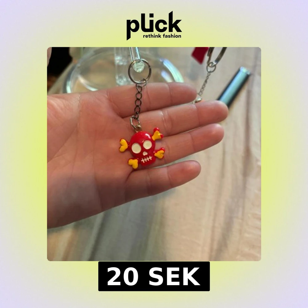 Nyckelring med en röd dödskalle och korsade ben formade som gula hjärtan. Dödskallen har vita ögon och tänder, och hänger i en metallkedja. Perfekt accessoar för dig som gillar unika detaljer.