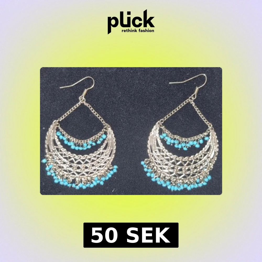 Unika silvriga örhängen med hängande kedjor och detaljerade mönster. Dekorerade med små turkosa pärlor som ger en färgklick och bohemisk känsla. Perfekt för dig som vill sticka ut med snygga accessoarer.