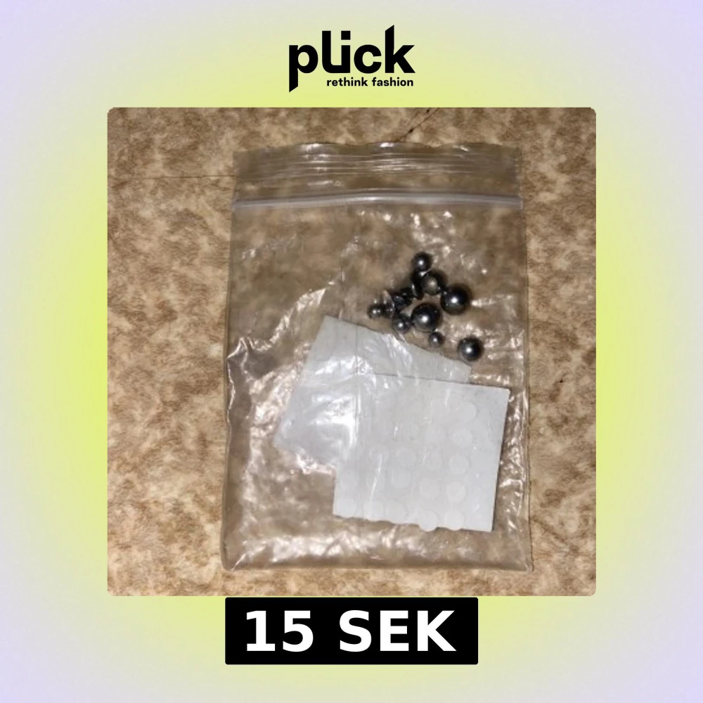 En påse random kulor och två spikes. Perfect om man vill testa ngn ny pircing. De e små klistermärken man sätter fast som med me men skulle föreslå eyelash glue om man vill att det håller en hel dag. Helt oanvända bra