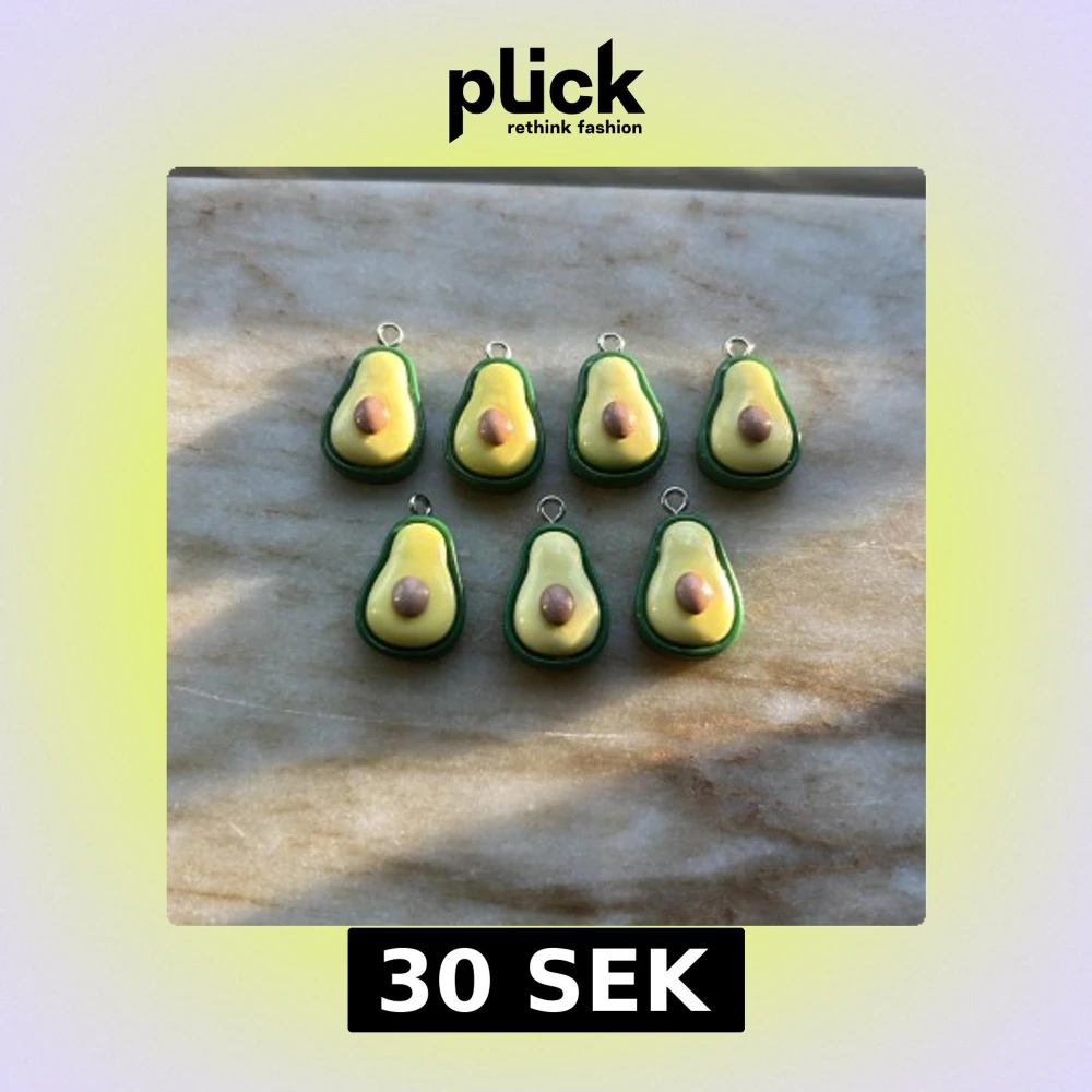 Säljer sju söta avocado-berlock i plast, perfekta att använda till halsband eller armband. Hängena har en grön kant, gul insida och en brun prick som kärna. De är formade som halva avokados och har en liten ögla för att fästa på smycken.