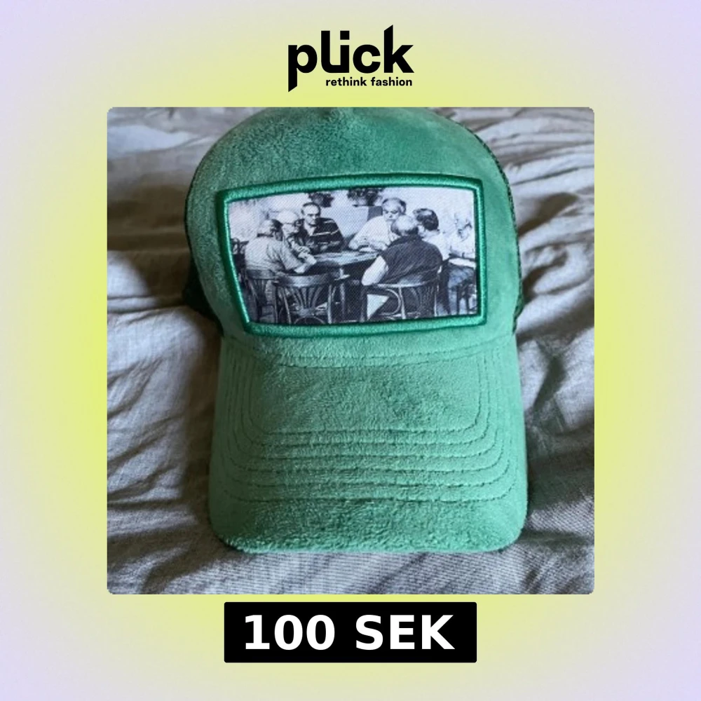 Snygg grön keps från Emilio Pendenza med mjuk mockaliknande yta och mesh baktill. Framtill finns en stor patch med svartvit fototryck av personer runt ett bord. Justerbar snapback för perfekt passform.