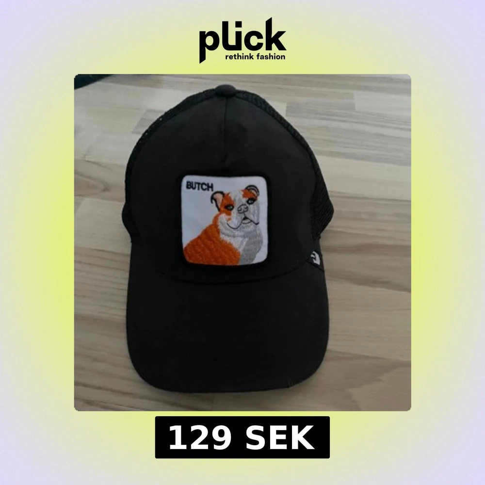 Svart truckerkeps med mesh på sidorna och justerbar snapback. Framtill sitter en broderad patch med en orange och vit bulldog och texten 'BUTCH'. Kepsen har böjd skärm och klassisk form, perfekt för en avslappnad streetstil.
