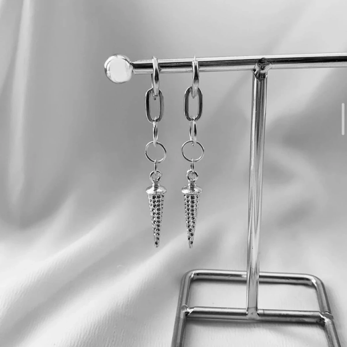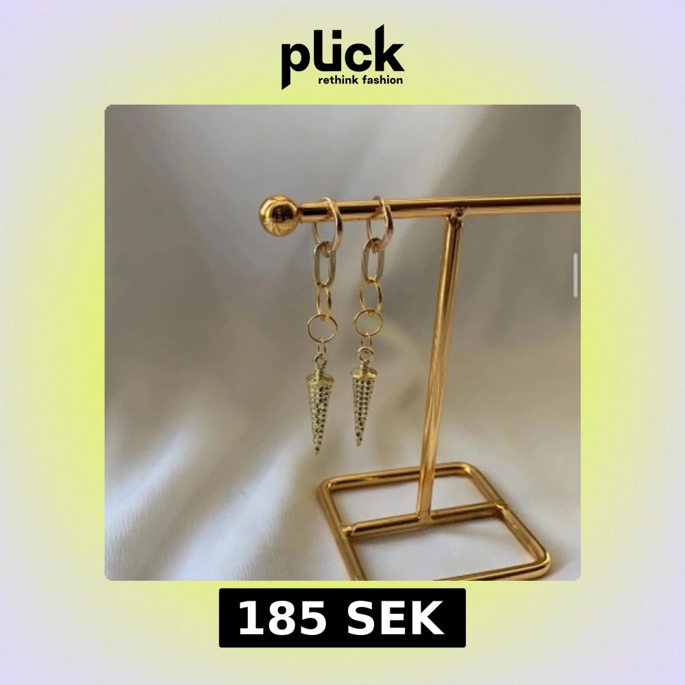 Snygga örhängen i guld med kedjelänkar och spetsiga konformade hängen med små nitar. Ger en edgy vibe och passar perfekt om du vill sticka ut. Lätta att bära och riktigt trendiga.