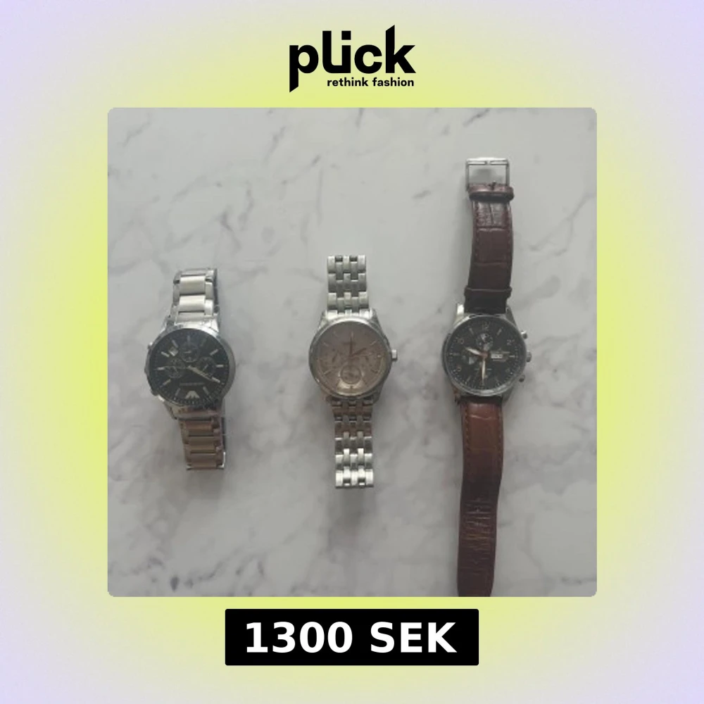 đžPRIS KAN DISKUTERASđžSĂ€ljer nu min herrklocksamling. Armani klocka med smĂ„ repor som gĂ„r att laga men Ă€r knappt synliga. Guess klocka med mer synliga mini repor. Jaques Lemans klocka Ă€kta lĂ€der bra skick! Ni sparar runt 6-7000 kr pĂ„ Armani o lemans klockorna, Guess klockan fick jag gratis sĂ„ den fĂ„r ni pĂ„ köpet! â ïžbatteri mĂ„ste bytas pĂ„ alla klockor! Oavsett sĂ„ Ă€r det hĂ€r en STEAL! Ni kan laga o sĂ€lja vidare dem separat! Min vrist Ă€r 17 cm i omkrets. Armani Ă€r lite lös, guess för tight
