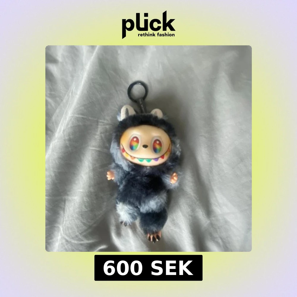 Säljer en unik och fluffig nyckelringsväska från Pop Mart. Väskan är formad som en söt figur med regnbågsfärgat ansikte och päls i mörkgrå och ljusgrå toner. Perfekt att hänga på väskan eller använda som liten accessoar.