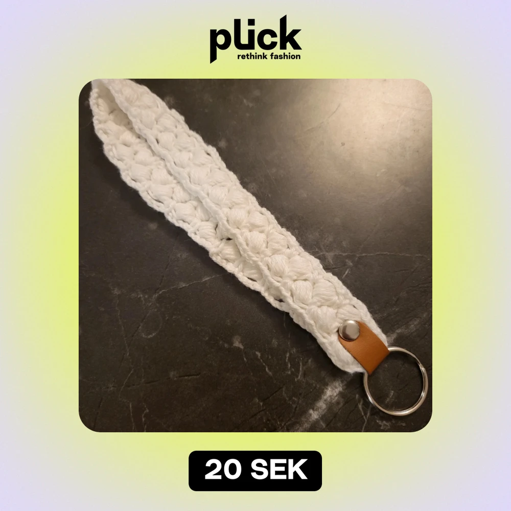 Snygg och unik vit virkad nyckelring med en liten läderdetalj och metallring. Virkad i 100% bomull. Perfekt för att hålla koll på dina nycklar med stil 😊 Den är handgjord och har en bohemisk känsla. Passar perfekt som en liten present eller för att piffa upp din egen nyckelknippa.