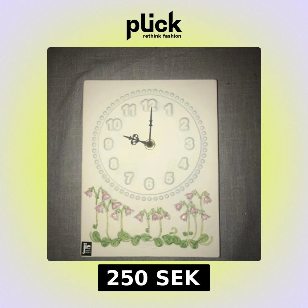 Charmig väggklocka i keramik från Jie Gantofta med blommönster i rosa och grönt. Klockan har en rektangulär form och tydliga siffror i en cirkel. Perfekt för att ge en romantisk touch till ditt hem.