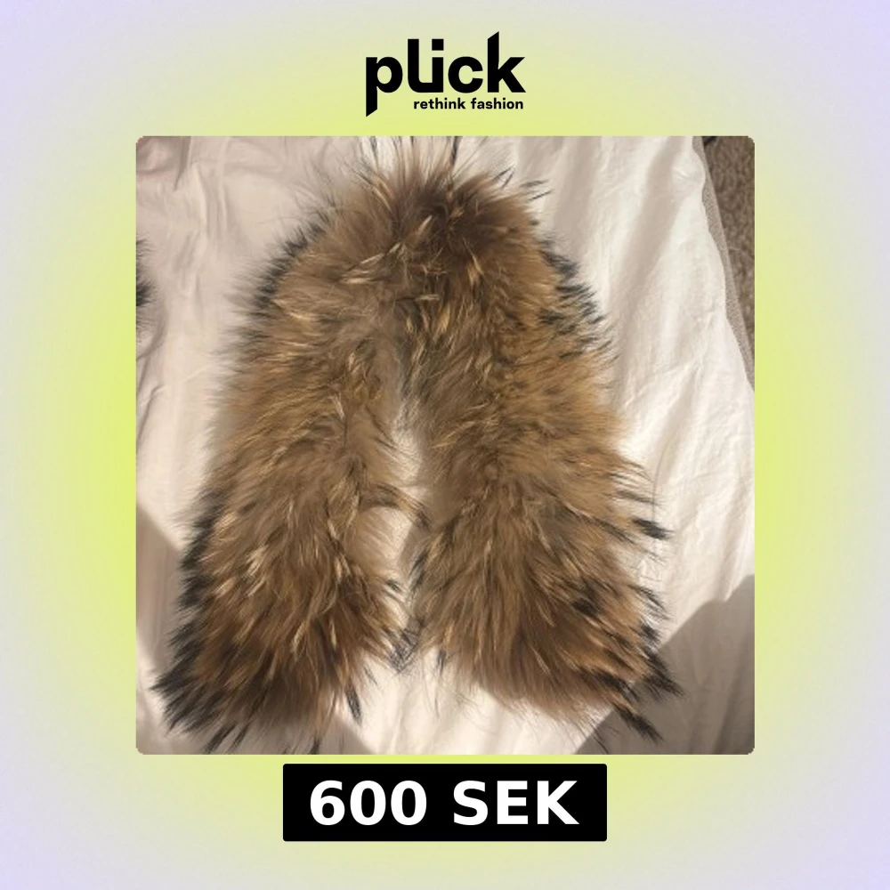 Säljer en fluffig avtagbar päls för jackor i brun med svarta toppar. Pälsen har en bred och rundad form med knappar på insidan för enkel fastsättning.