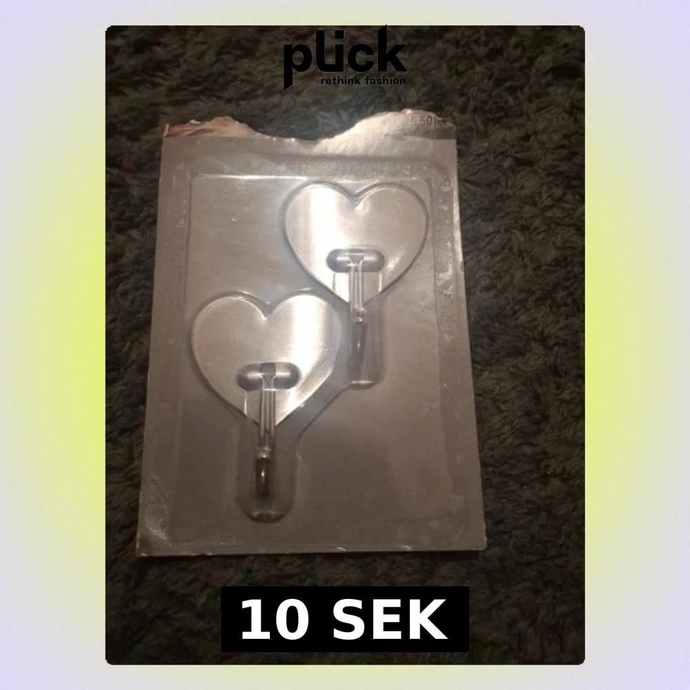 Bilden visar två hjärtformade krokar i plastförpackning, tror de är som klistermärken bakom hjärtna.
